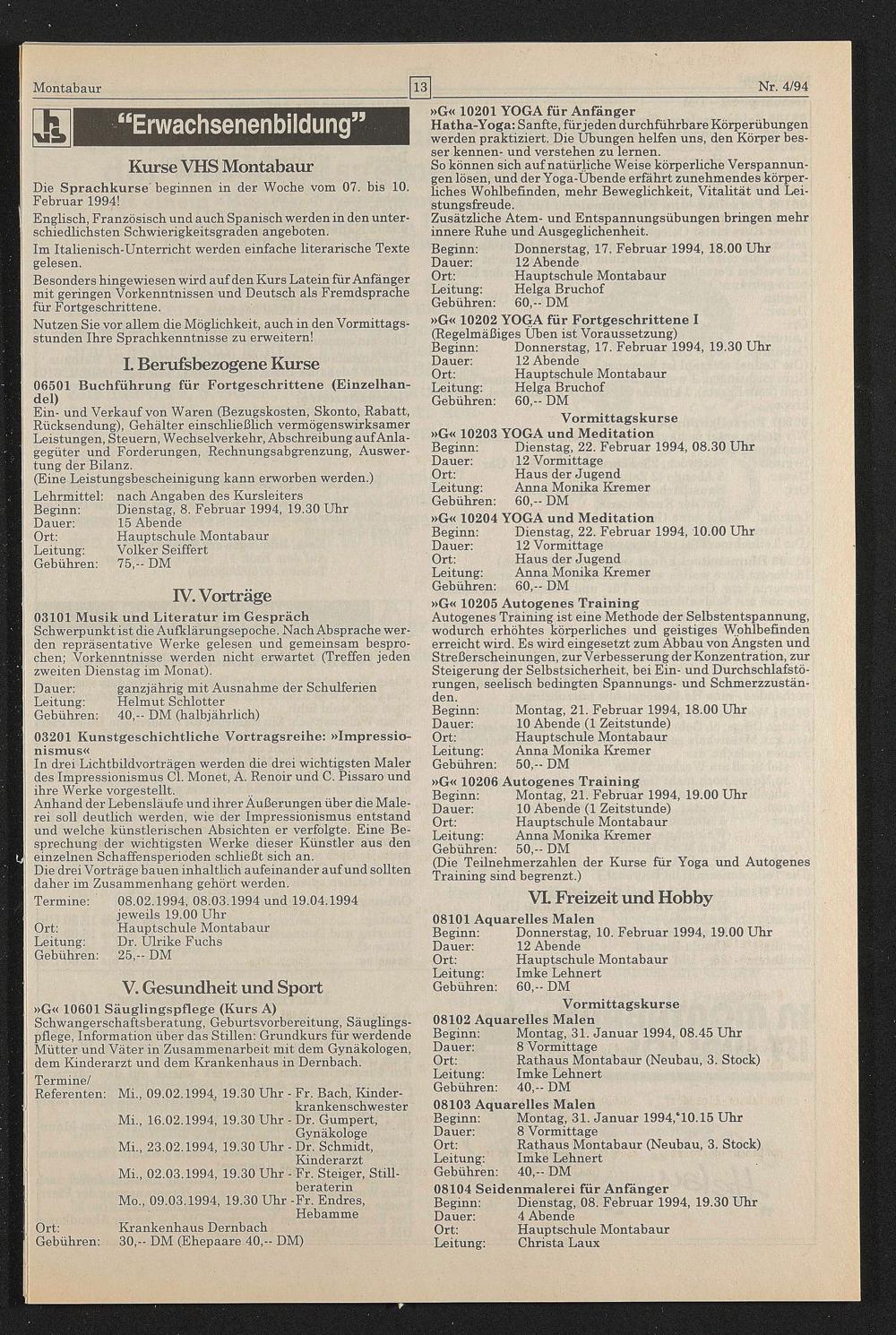 Beginn: Donnerstag, 10. Februar 1994, 19.00 Uhr