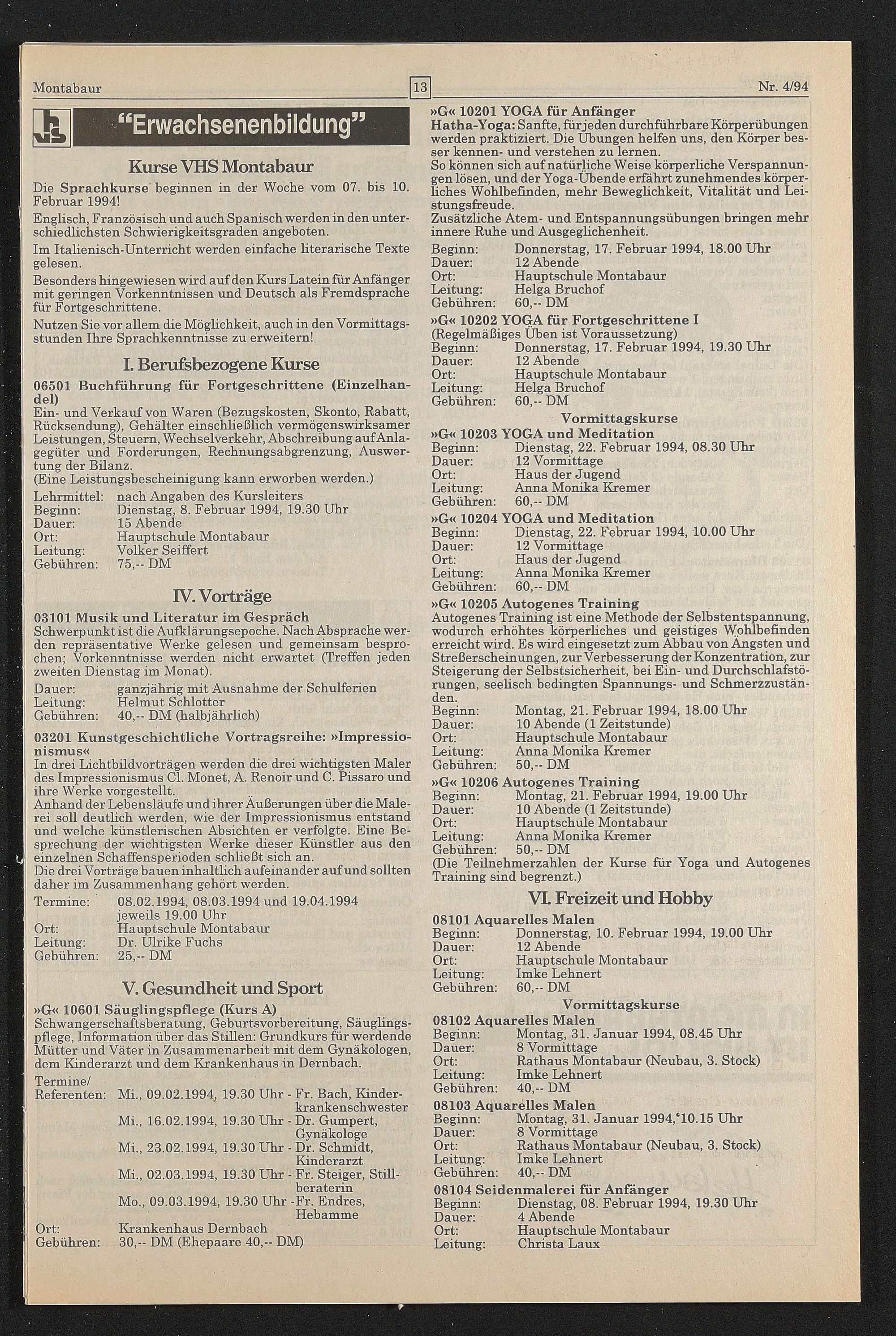 Die Sprachkurse' beginnen in der Woche vom 07. bis 10. Februar 1994!