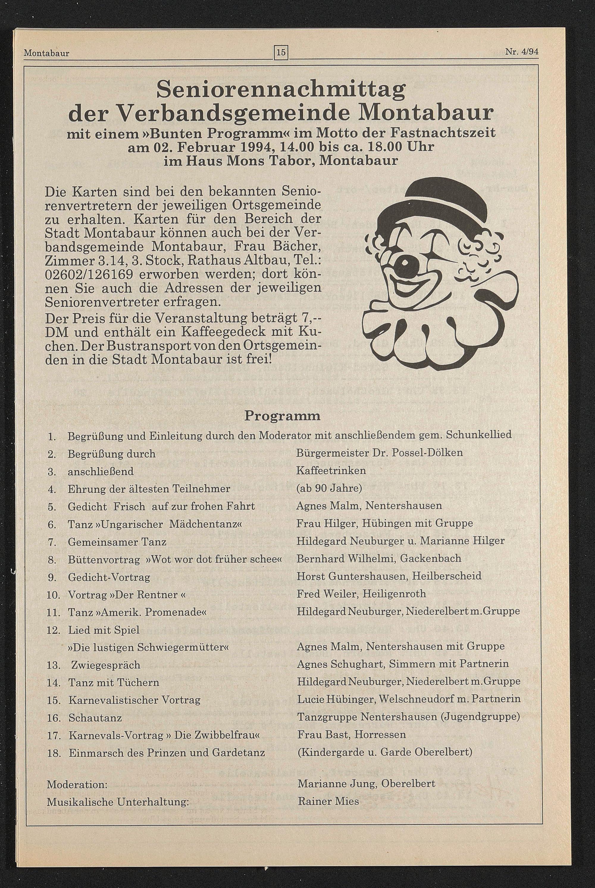 mit einem »Bunten Programm« im Motto der Fastnachtszeit am 02. Februar 1994,14.00 bis ca. 18.00 Uhr im Haus Mons Tabor, Montabaur