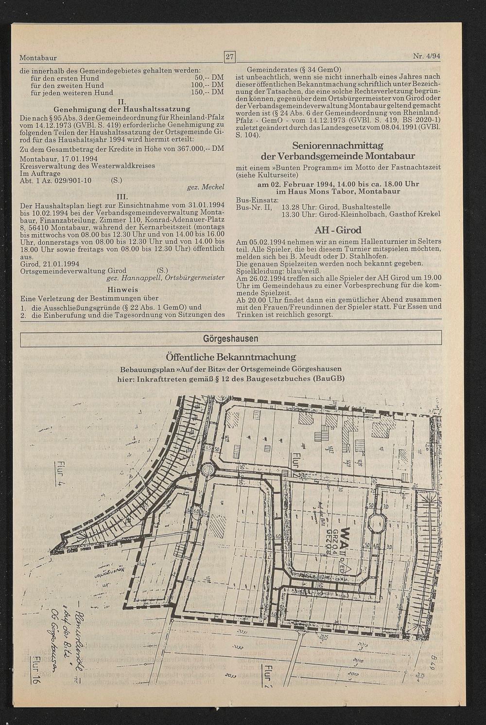 Der Haushaltsplan liegt zur Einsichtnahme vom 31.01.1994 bis 10.02.1994 bei der Verbandsgemeindeverwaltung Montabaur, Finanzabteilung, Zimmer 110, Konrad-Adenauer-Platz 8, 56410 Montabaur, während der Kernarbeitszeit (montags bis mittwochs von 08.00 bis 12.30 Uhr und von 14.00 bis 16.00 Uhr, donnerstags von 08.00 bis 12.30 Uhr und von 14.00 bis 18.00 Uhr sowie freitags von 08.00 bis 12.30 Uhr) öffentlich aus.