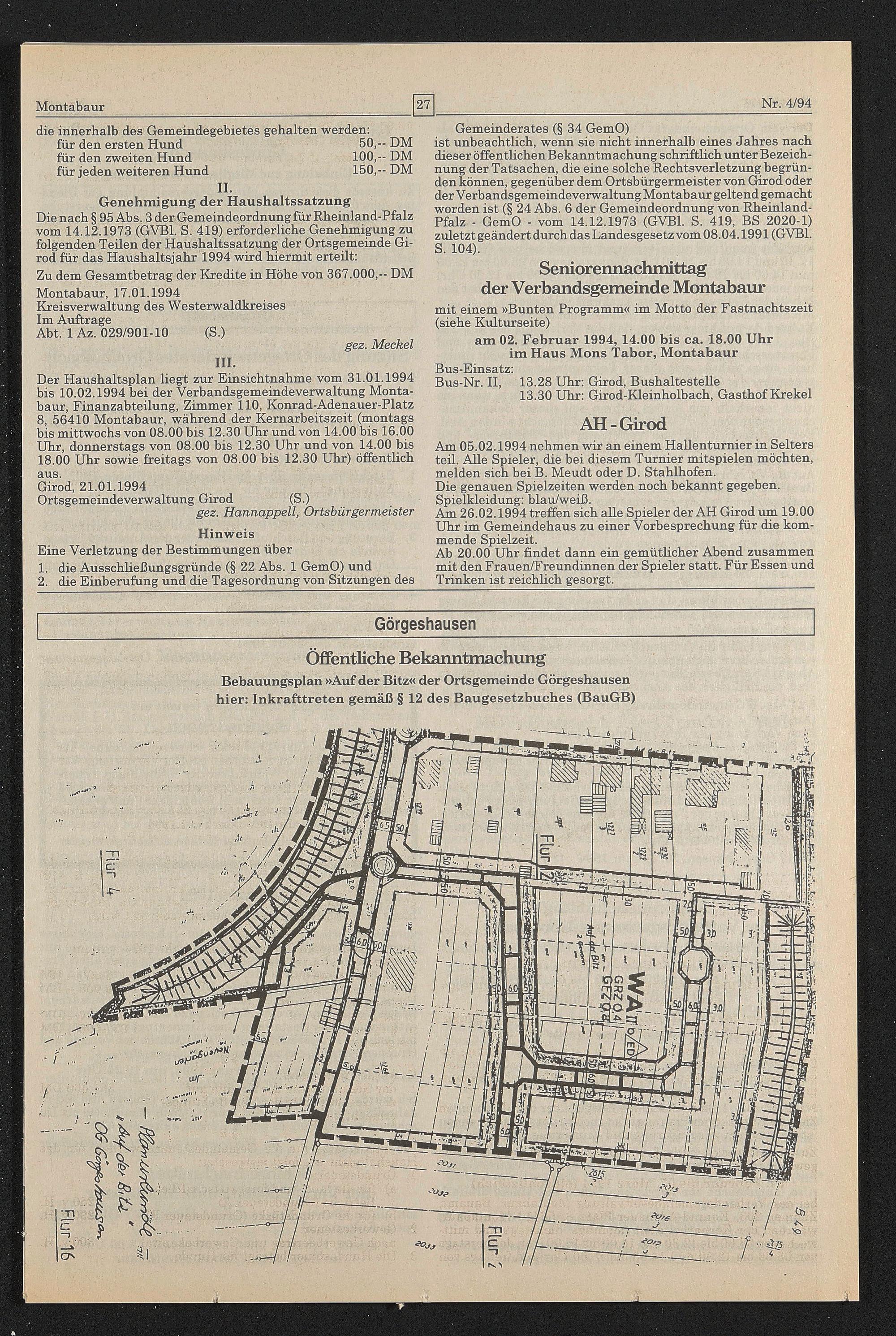 Genehmigung der Haushaltssatzung Die nach § 95 Abs. 3 der Gemeindeordnung für Rheinland-Pfalz vom 14.12.1973 (GVB1. S. 419) erforderliche Genehmigung zu folgenden Teilen der Haushaltssatzung der Ortsgemeinde Girod für das Haushaltsjahr 1994 wird hiermit erteilt: