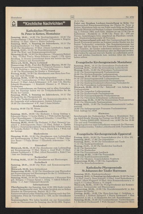 Fahrt zur Stephan Lochner-Ausstellung in Köln: Der Sachausschuß Erwachsenenbildung der Pfarrei St. Peter in Ketten, Montabaur lädt ein zur Fahrt nach Köln ins Wallraff- Richards-Museum zur Stephan-Lochner-Ausstellung für Samstag, 5. Februar 1994, nach Köln. Abfahrt ist um 13.30 Uhr ab Kalbswiese - Rückkehr ca. 18.00 Uhr. Preis: 25,- DM pro Person.- Anmeldungen bitte umgehend im Pfarrbüro vornehmen. Mindestteilnehmerzahl 30 Personen.