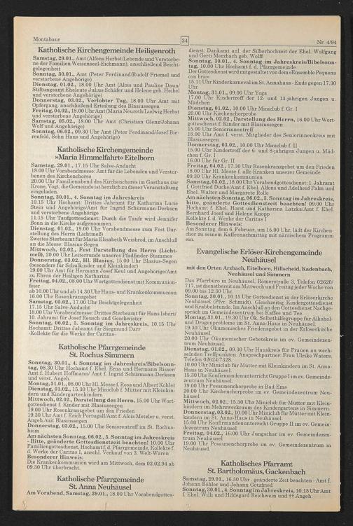 Samstag, 29.01., 16.30 Uhr - geänderte Zeit beachten - Amt f. Johann Böhler und Johann Götzfried Sonntag, 30.01., 4. Sonntag im Jahreskreis, 10.15 Uhr Amt f. Ehel. Willi und Hildegard Reichwein und ff Angeh.