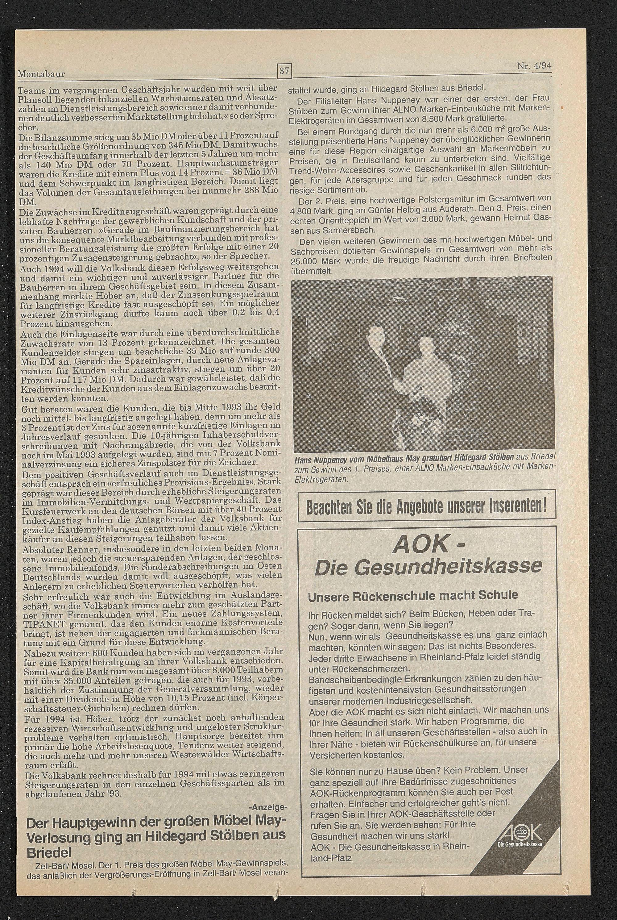 Für 1994 ist Höher, trotz der zunächst noch anhaltenden rezessiven Wirtschaftsentwicklung und ungelöster Strukturprobleme verhalten optimistisch. Hauptsorge bereitet ihm primär die hohe Arbeitslosenquote, Tendenz weiter steigend, die auch mehr und mehr unseren Westerwälder Wirtschaftsraum erfaßt.