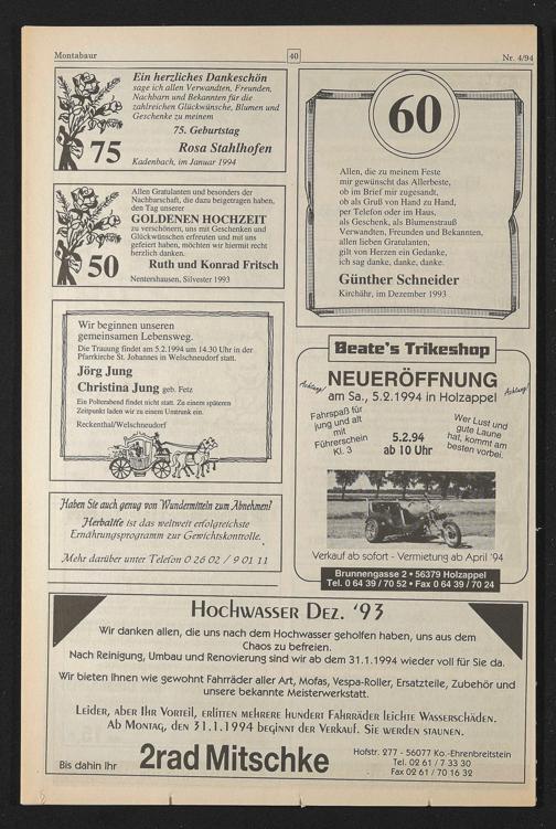 Nach Reinigung, Umbau und Renovierung sind wir ab dem 31.1.1994 wieder voll für Sie da.