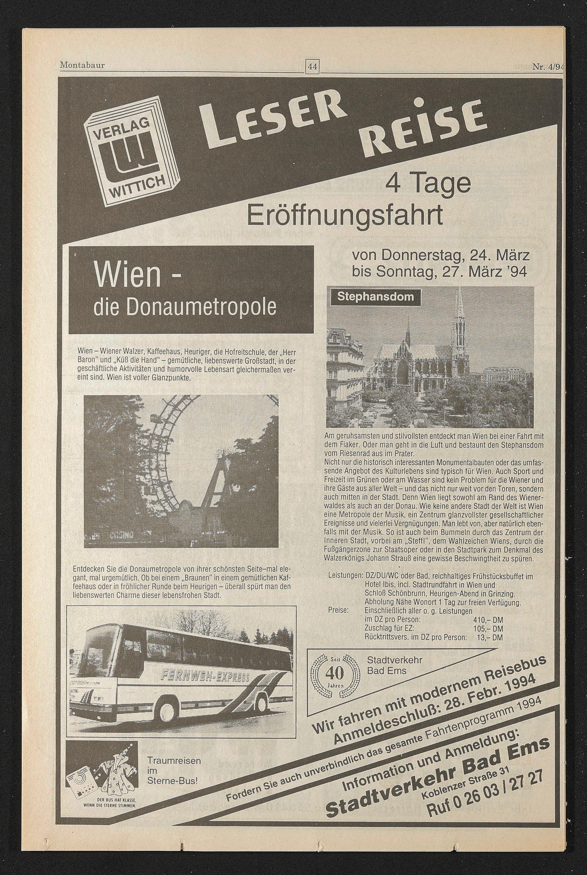 Leistungen: DZ/DU/WC oder Bad, reichhaltiges Frühstücksbuffet im Hotel Ibis, incl. Stadtrundfahrt in Wien und Schloß Schönbrunn, Heurigen-Abend in Grinzing. Abholung Nähe Wonort 1 Tag zur freien Verfügung. Einschließlich aller o. g. Leistungen im DZ pro Person: 410,-DM