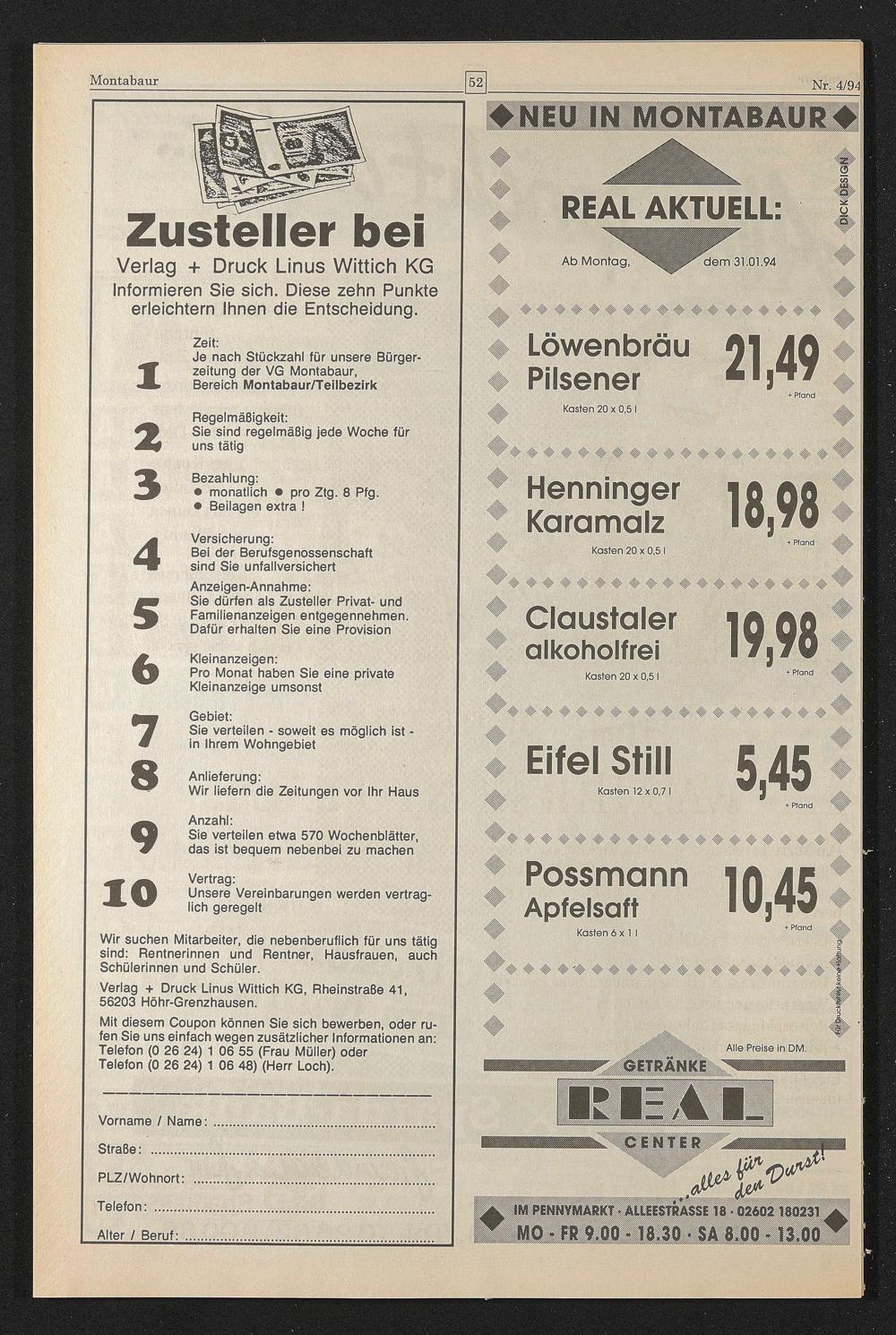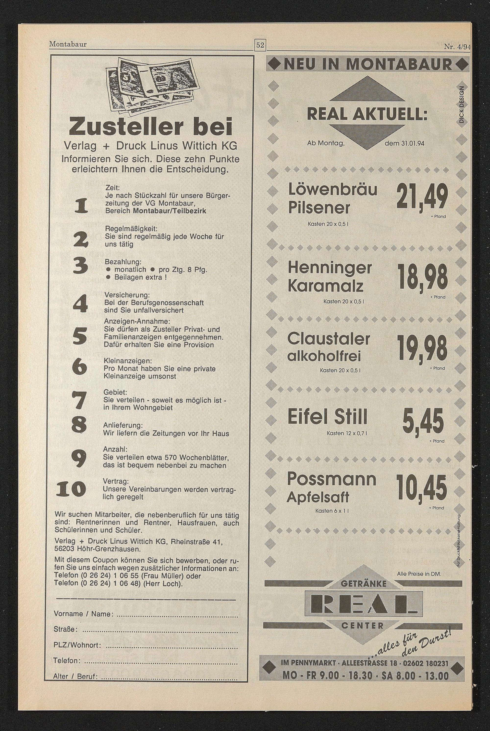 Mit diesem Coupon können Sie sich bewerben, oder rufen Sie uns einfach wegen zusätzlicher Informationen an: Telefon (0 26 24) 1 06 55 (Frau Müller) oder Telefon (0 26 24) 1 06 48) (Herr Loch).