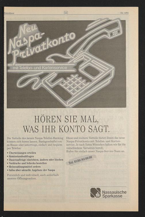 Diese und weitere Vorteile bietet Ihnen das neue Naspa-Privatkonto mit Telefon- und Kartenservice. Je nach Ihren Wünschen halten wir für Sie verschiedene Varianten bereit.
