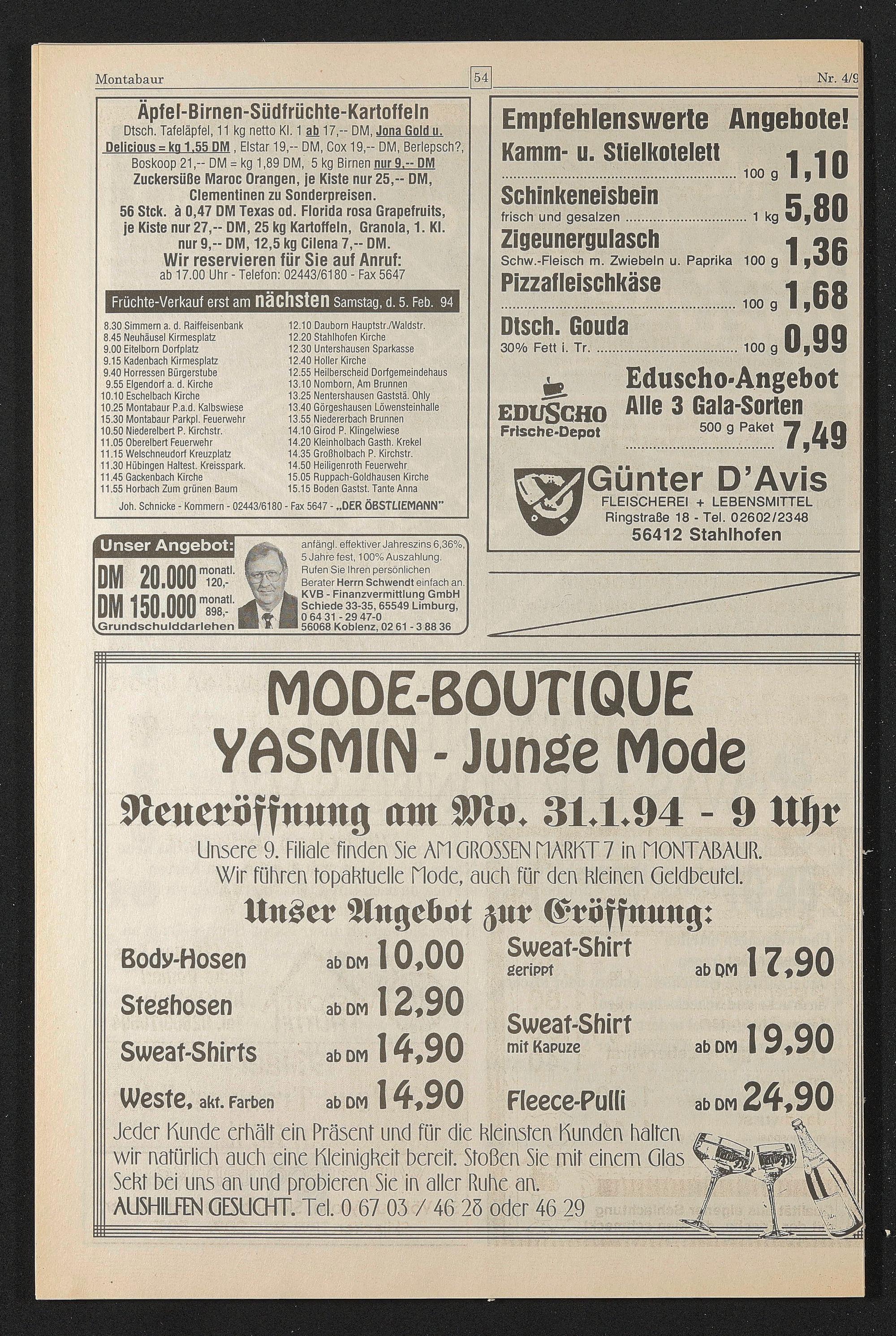 Dtsch. Tafeläpfel, 11 kg netto Kl. 1 ah 17,- DM, Jona Gold u. Delicious = ko1.55 DM , Eistar 19,- DM, Cox 19,-- DM, Berlepsch?, Boskoop 21,- DM = kg 1,89 DM, 5 kg Birnen nur 9.-- DM Zuckersüße Maroc Orangen, je Kiste nur 25,-- DM, Clementinen zu Sonderpreisen.