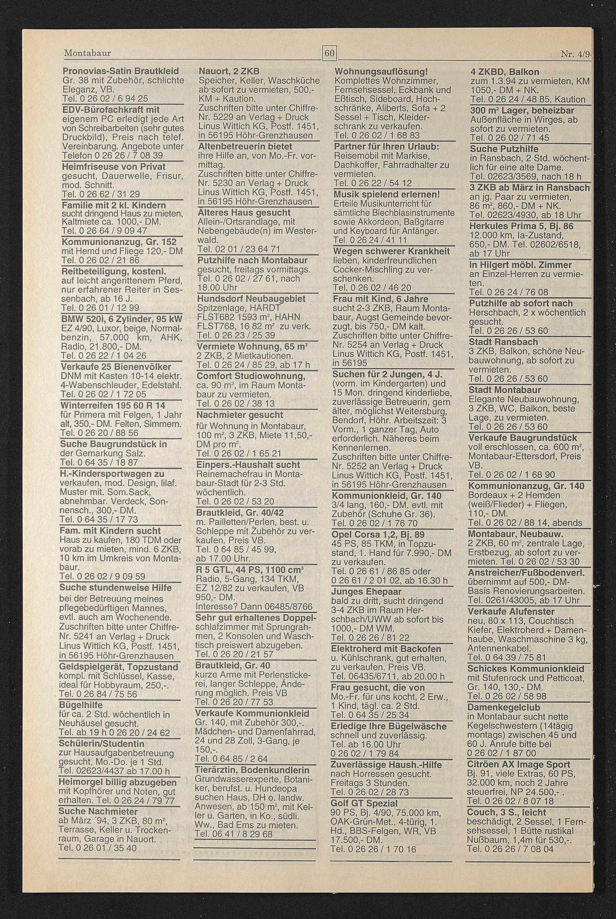 Frau mit Kind, 6 Jahre sucht 2-3 ZKB, Raum Montabaur, Augst Gemeinde bevorzugt, bis 750,- DM kalt. Zuschriften bitte unter Chiffre- Nr. 5254 an Verlag + Druck Linus Wittich KG, Postf. 1451, in 56195_