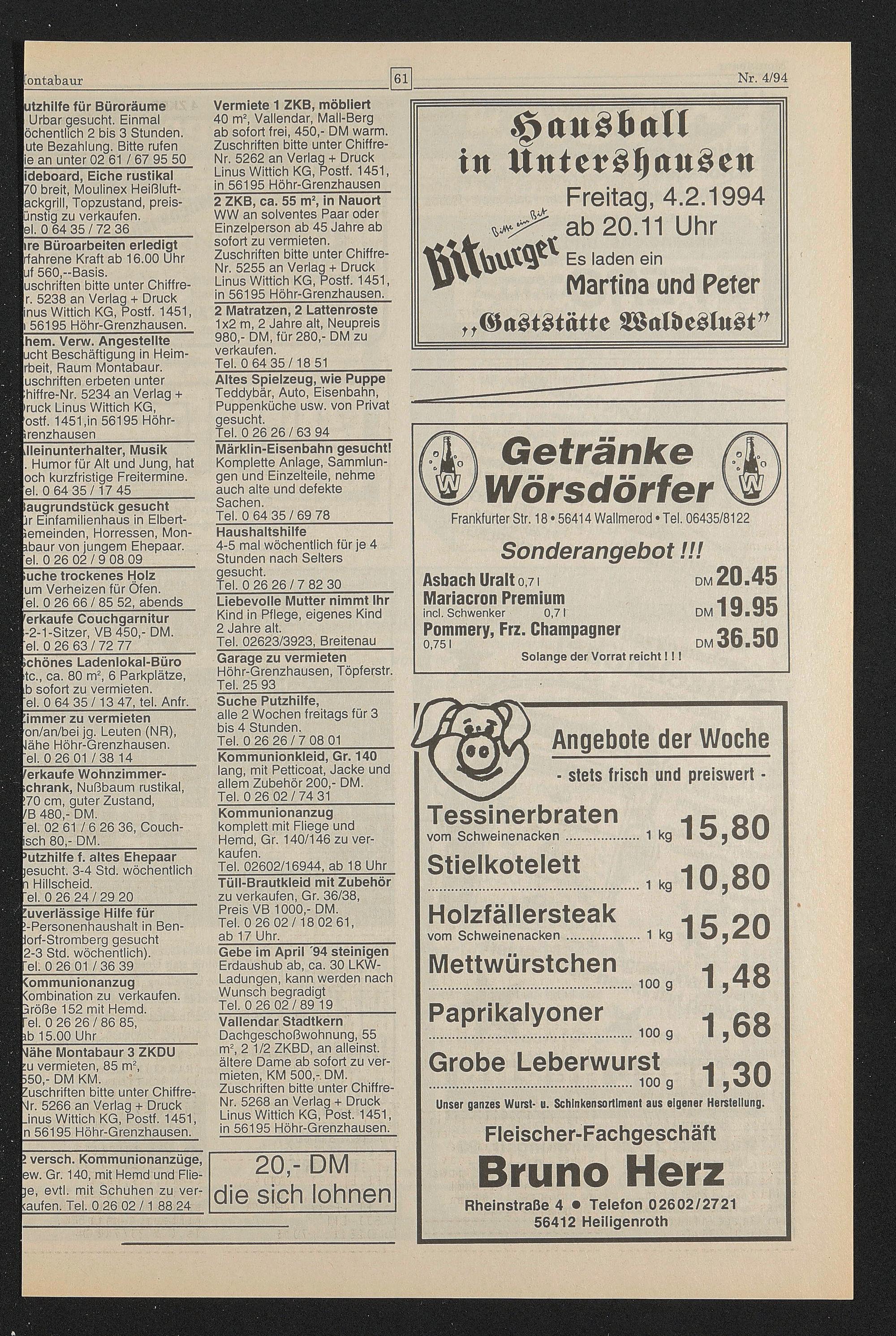 Zuschriften bitte unter Chiffre- Nr. 5266 an Verlag + Druck Linus Wittich KG, Postf. 1451, n 56195 Höhr-Grenzhausen.