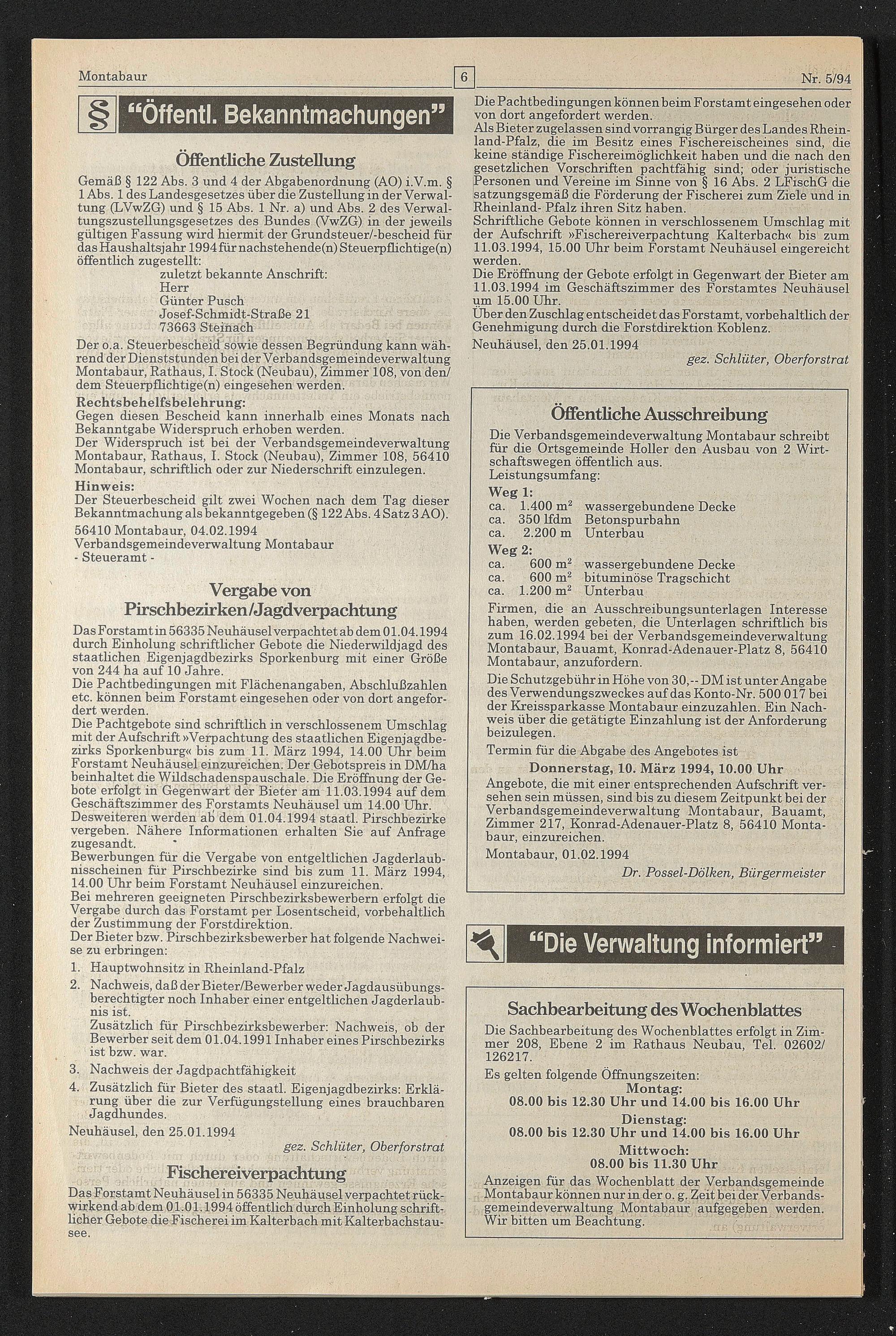 56410 Montabaur, 04.02.1994 Verbandsgemeindeverwaltung Montabaur - Steueramt -