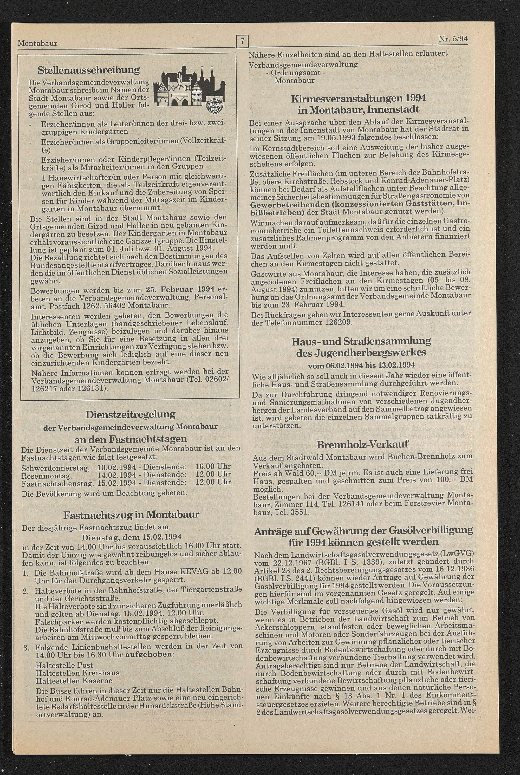 Bewerbungen werden bis zum 25. Februar 1994 erbeten an die Verbandsgemeindeverwaltung, Personalamt, Postfach 1262, 56402 Montabaur.