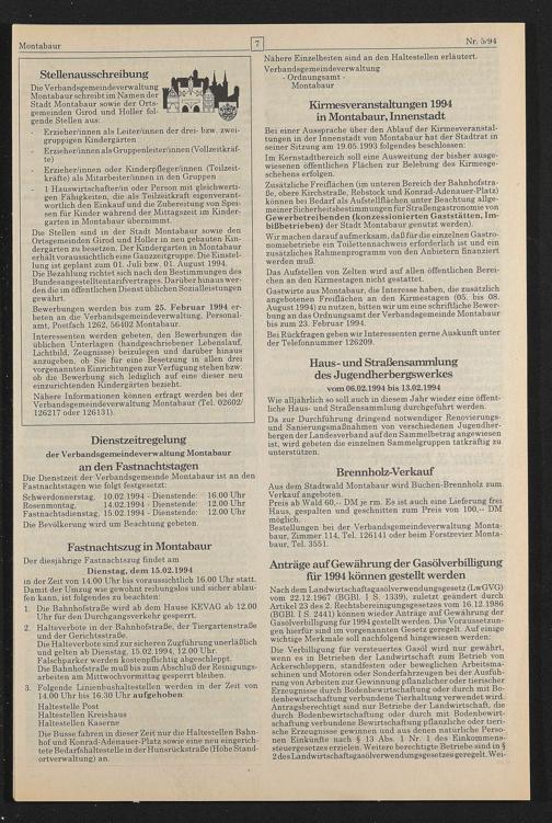 Die Stellen sind in der Stadt Montabaur sowie den Ortsgemeinden Girod und Holler in neu gebauten Kindergärten zu besetzen. Der Kindergarten in Montabaur erhält voraussichtlich eine Ganzzeitgruppe. Die Einstellung ist geplant zum 01. Juli bzw. 01. August 1994.