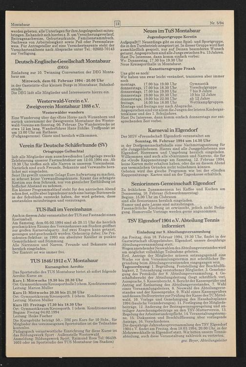 Mittwoch, dem 02. Februar 1994 - 20.00 Uhr in der Gaststätte »Zur kleinen Burg« in Montabaur, Bahnhofstraße.