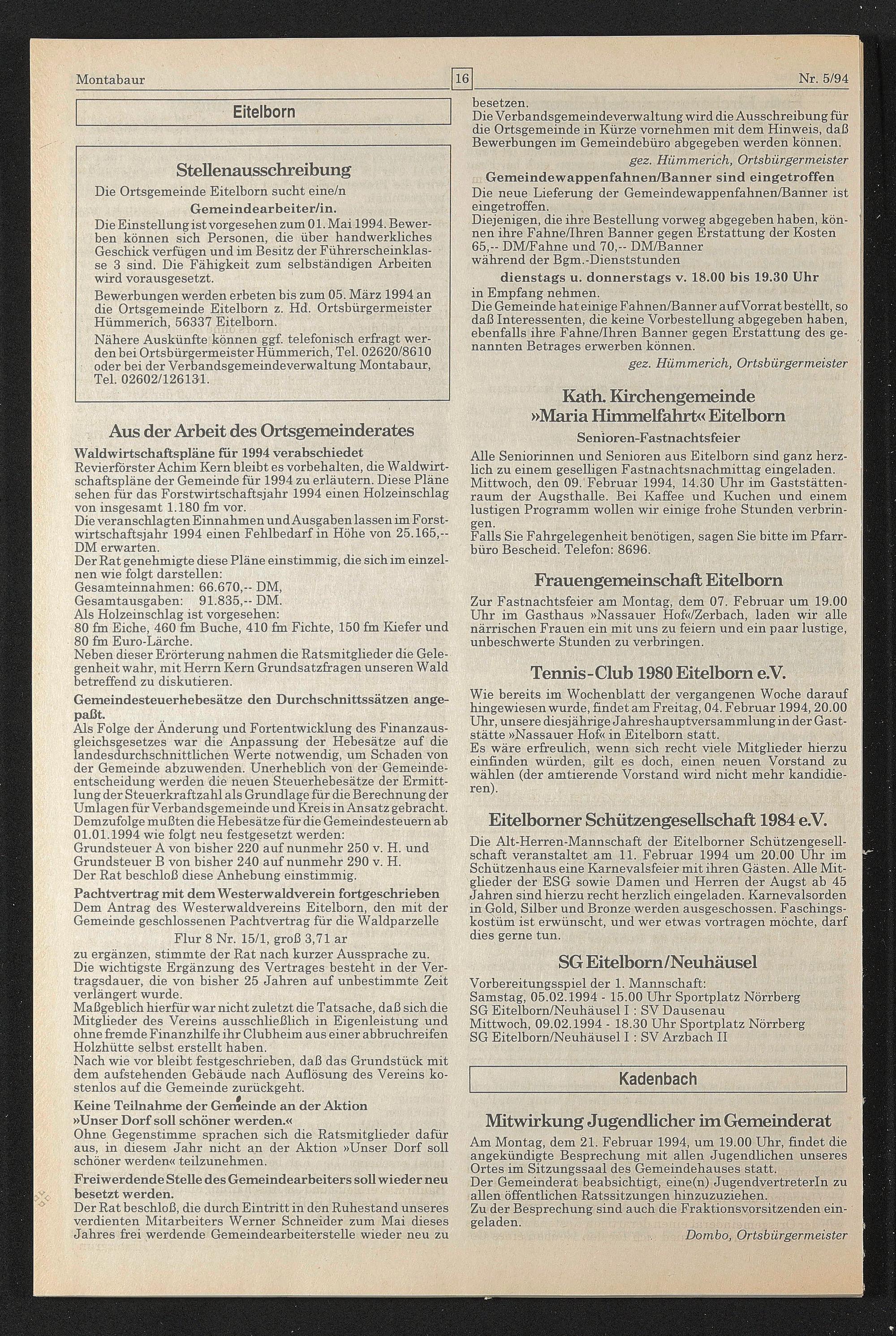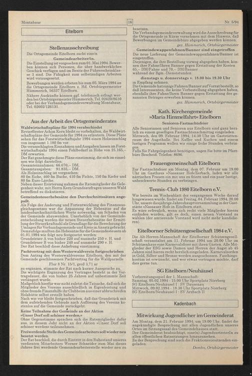 Bewerbungen werden erbeten bis zum 05. März 1994 an die Ortsgemeinde Eitelborn z. Hd. Ortsbürgermeister Hümmerich, 56337 Eitelborn.