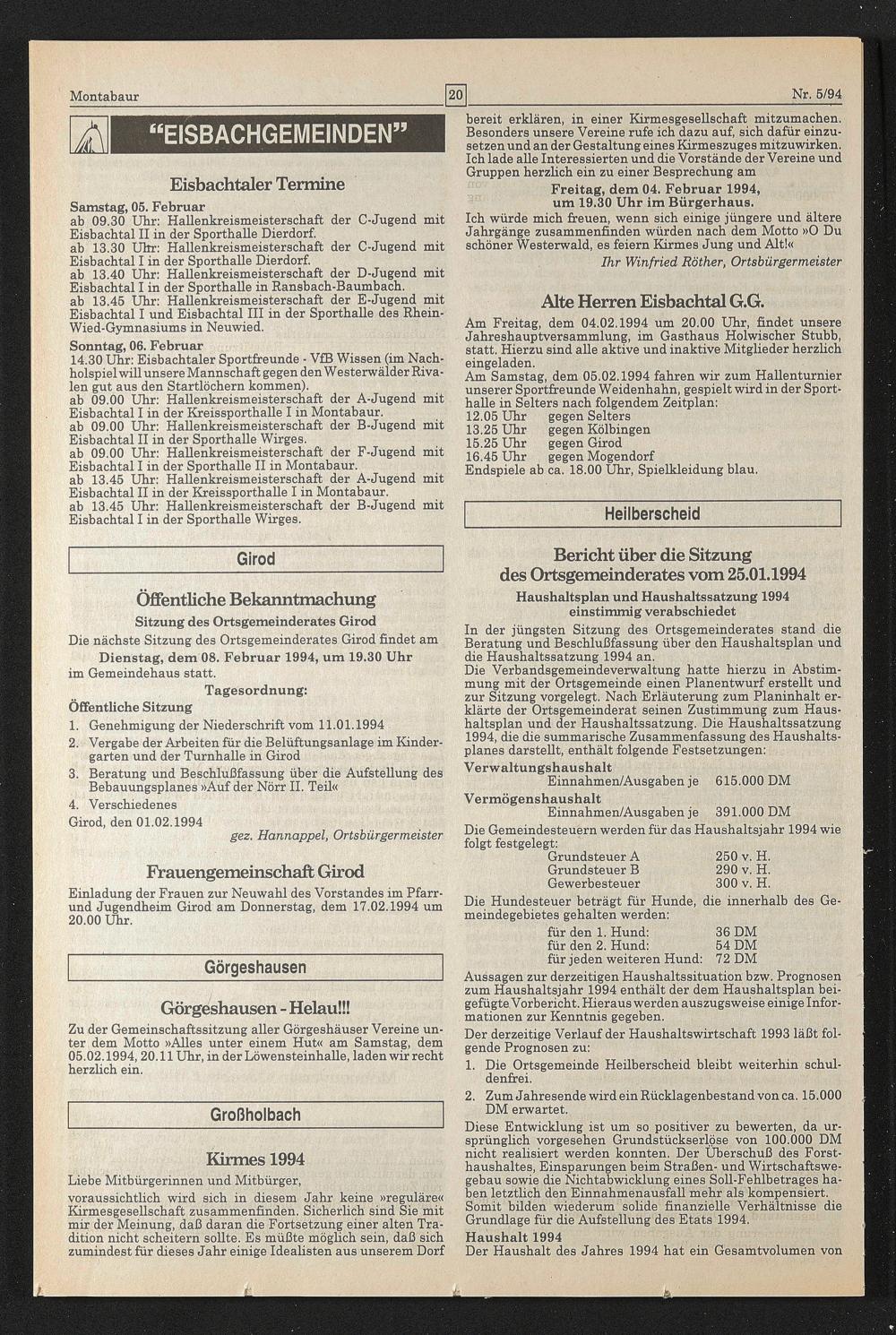 Öffentliche Bekanntmachung Sitzung des Ortsgemeinderates Girod Die nächste Sitzung des Ortsgemeinderates Girod findet am Dienstag, dem 08. Februar 1994, um 19.30 Uhr im Gemeindehaus statt.