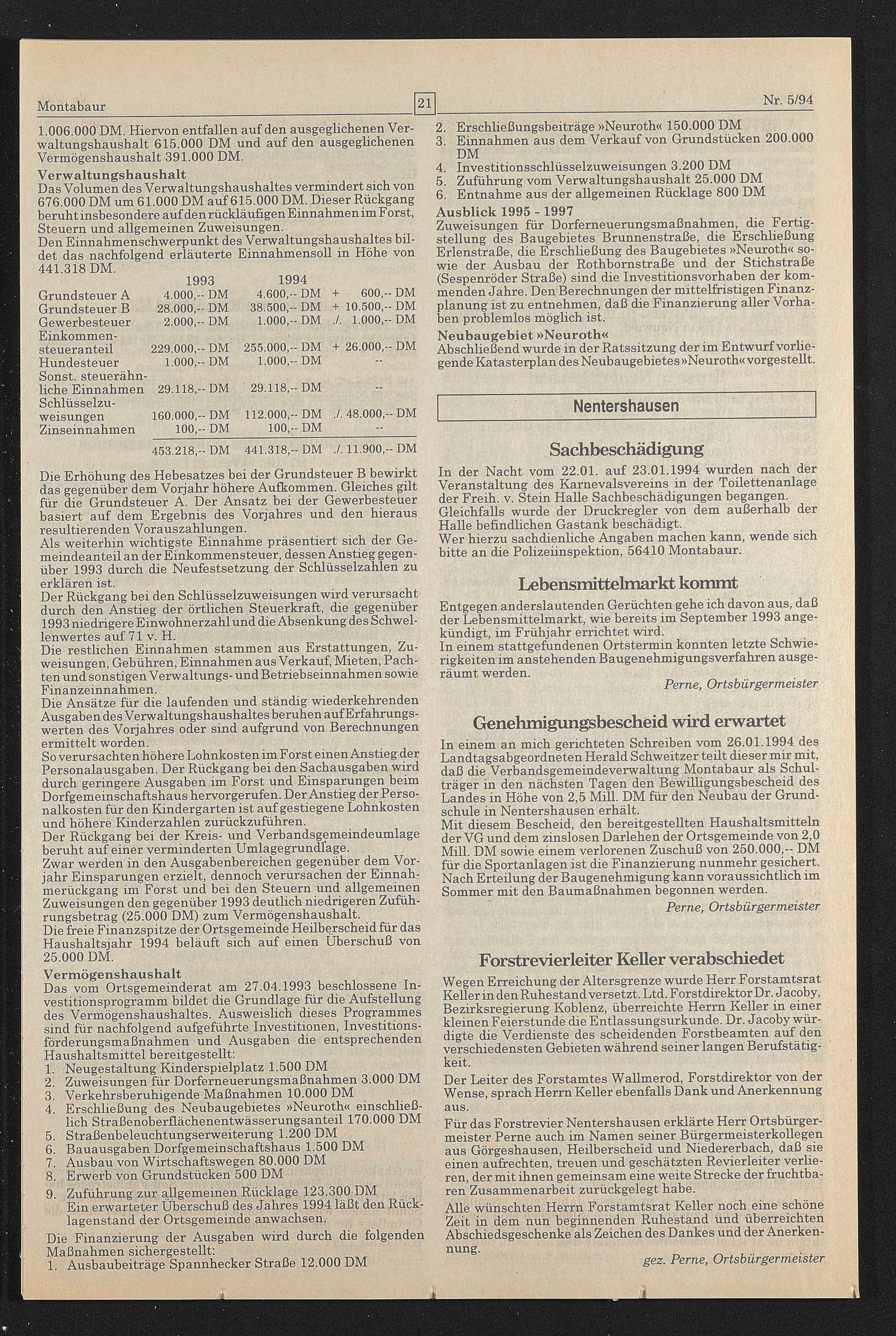 In einem an mich gerichteten Schreiben vom 26.01.1994 des Landtagsabgeordneten Herald Schweitzer teilt dieser mir mit, daß die Verbandsgemeindeverwaltung Montabaur als Schulträger in den nächsten Tagen den Bewilligungsbescheid des Landes in Höhe von 2,5 Mill. DM für den Neubau der Grundschule in Nentershausen erhält.