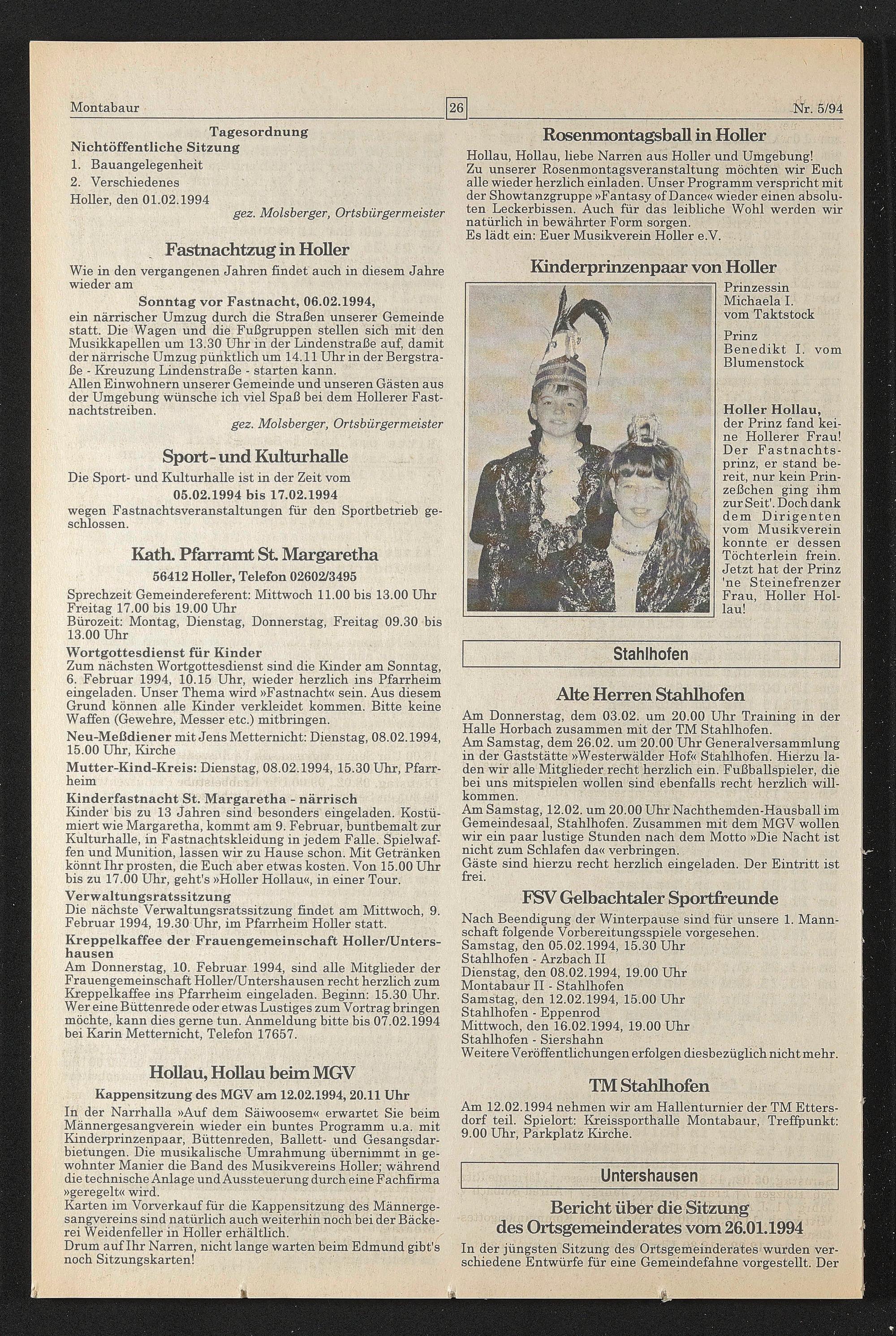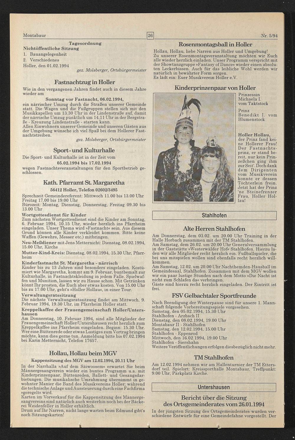 Bericht über die Sitzung des Ortsgemeinderates vom 26.01.1994