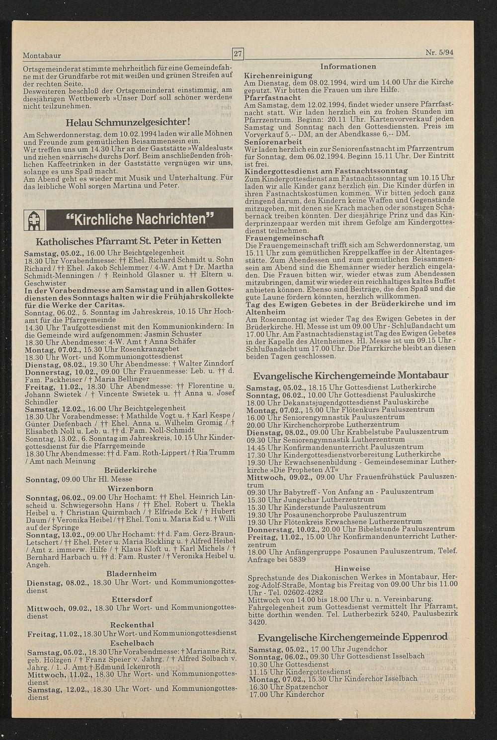 Am Dienstag, dem 08.02.1994, wird um 14.00 Uhr die Kirche geputzt. Wir bitten die Frauen um ihre Hilfe. Pfarrfastnacht