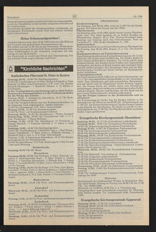 Wir laden herzlich ein zur Seniorenfastnacht im Pfarrzentrum für Sonntag, dem 06.02.1994. Beginn 15.11 Uhr. Der Eintritt ist frei.