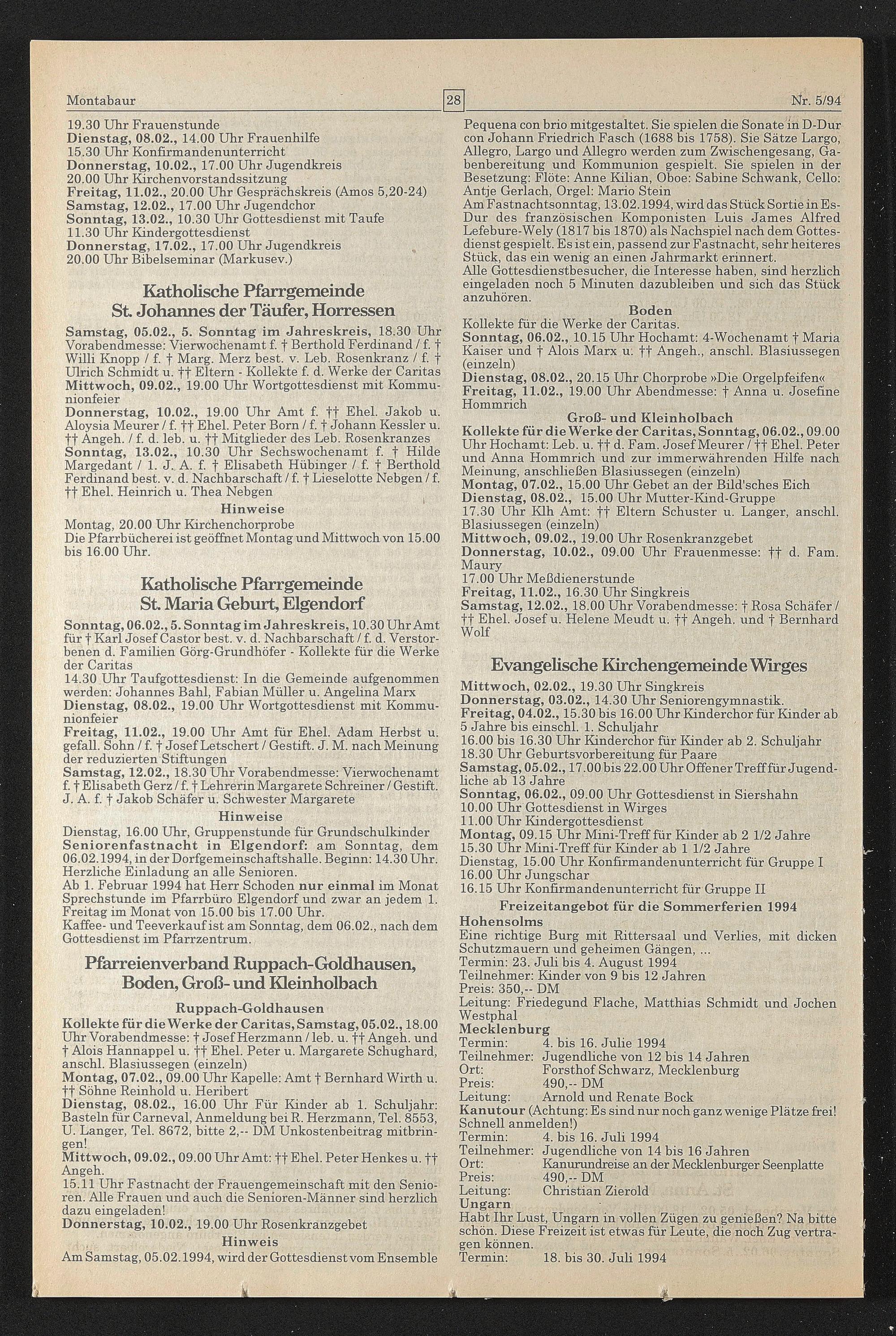 Dienstag, 16.00 Uhr, Gruppenstunde für Grundschulkinder Seniorenfastnacht in Eigendorf: am Sonntag, dem 06.02.1994, in der Dorfgemeinschaftshalle. Beginn: 14.30 Uhr. Herzliche Einladung an alle Senioren.
