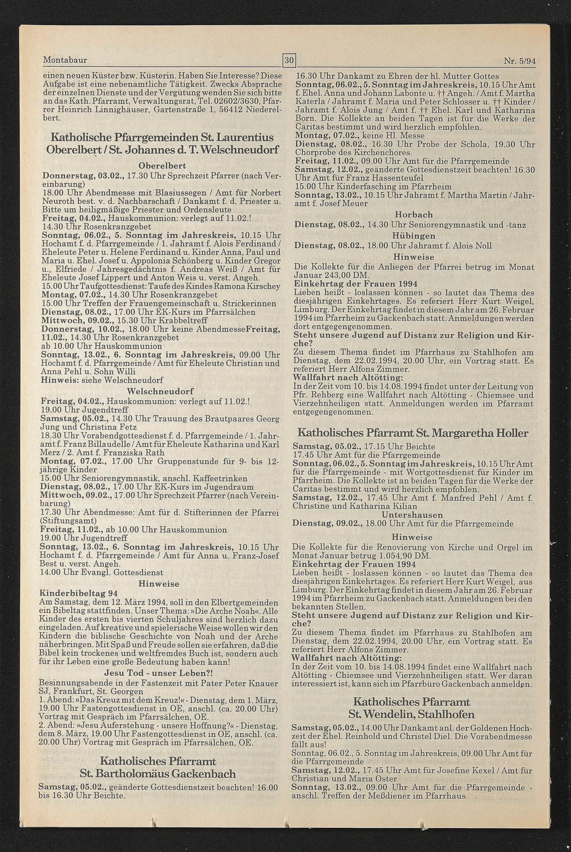 Zu diesem Thema findet im Pfarrhaus zu Stahlhofen am Dienstag, dem 22.02.1994, 20.00 Uhr, ein Vortrag statt. Es referiert Herr Alfons Zimmer.