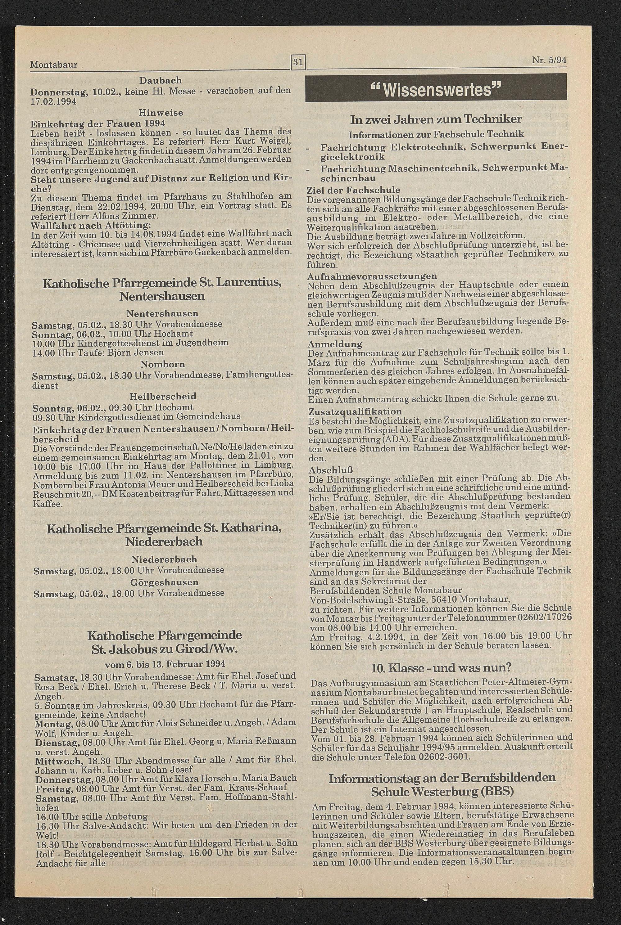 Vom 01. bis 28. Februar 1994 können sich Schülerinnen und Schüler für das Schuljahr 1994/95 anmelden. Auskunft erteilt die Schule unter Telefon 02602-3601.