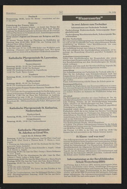 Am Freitag, dem 4. Februar 1994, können interessierte Schülerinnen und Schüler sowie Eltern, berufstätige Erwachsene mit Weiterbildungsabsichten und Frauen am Ende von Erziehungszeiten, die einen Wiedereinstieg in das Berufsleben planen, sich an der BBS Westerburg über geeignete Bildungsgänge informieren. Die Informationsveranstaltungen beginnen um 10.00 Uhr und enden gegen 15.30 Uhr.