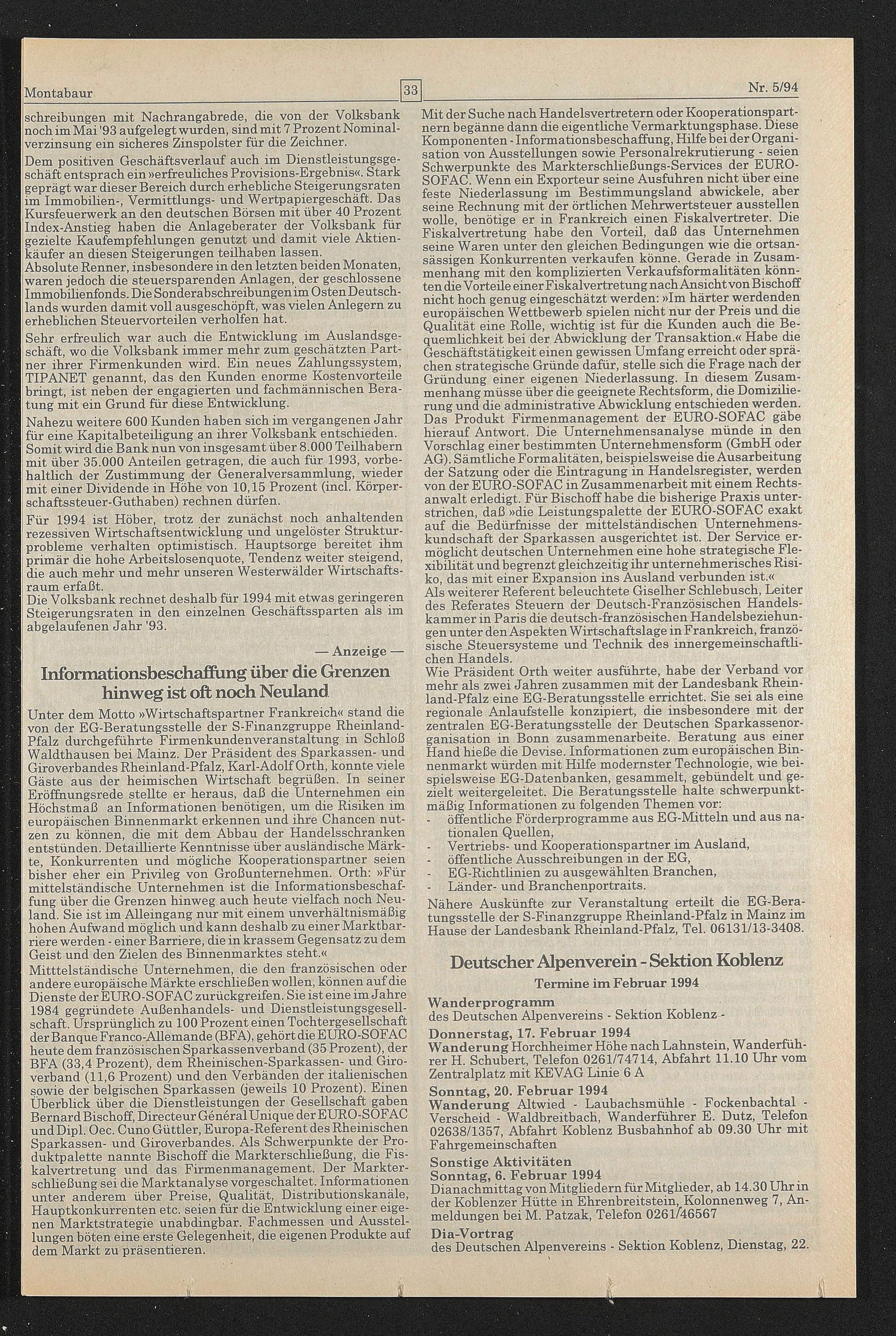 Deutscher Alpenverein - Sektion Koblenz Termine im Februar 1994 . Wanderprogramm