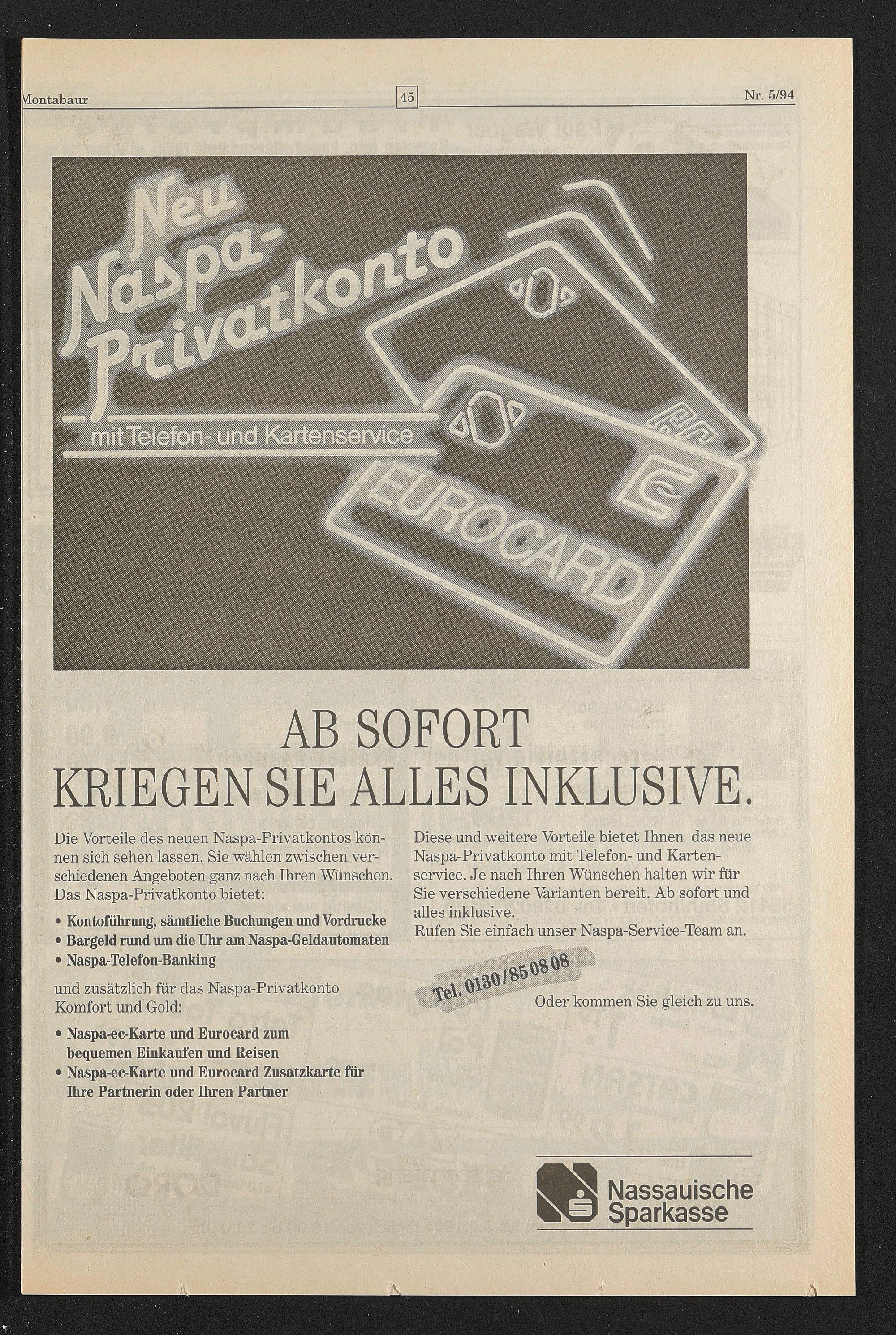 Diese und weitere Vorteile bietet Ihnen das neue Naspa-Privatkonto mit Telefon- und Kartenservice. Je nach Ihren Wünschen halten wir für Sie verschiedene Varianten bereit. Ab sofort und alles inklusive.