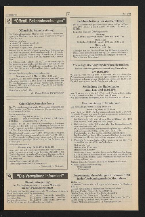 Wegen einer am Freitag, dem 18. Februar 1994 stattfindenden Personalversammlung enden die Sprechstunden bei der Verbandsgemeindeverwaltung Montabaur bereits um 10.45 Uhr. Es wird um entsprechende Beachtung gebeten.