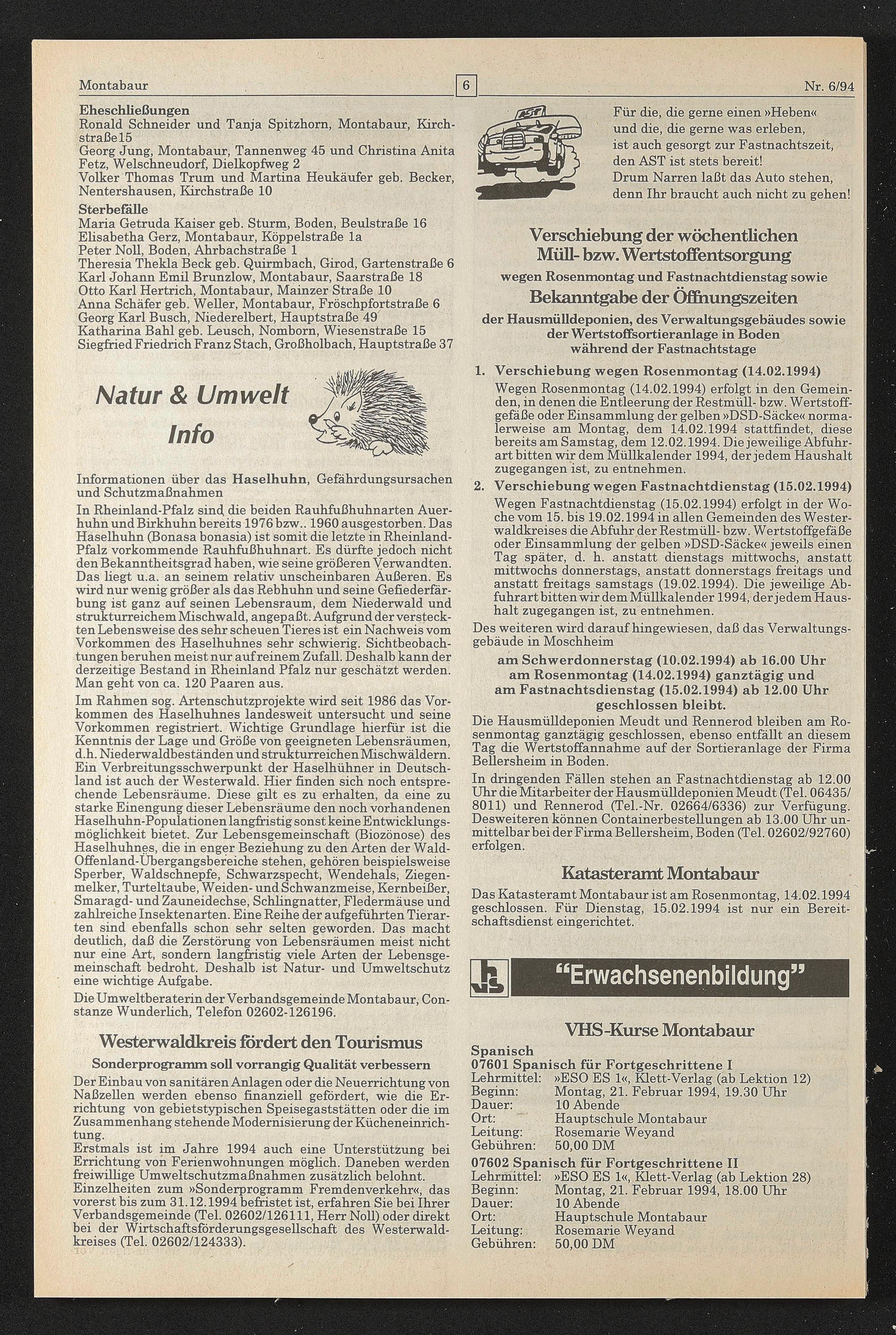 Das Katasteramt Montabaur ist am Rosenmontag, 14.02.1994 geschlossen. Für Dienstag, 15.02.1994 ist nur ein Bereitschaftsdienst eingerichtet.