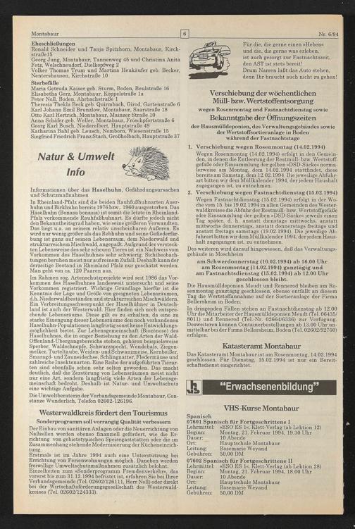 Wegen Rosenmontag (14.02.1994) erfolgt in den Gemeinden, in denen die Entleerung der Restmüll- bzw. Wertstoff- gefaße oder Einsammlung der gelben »DSD-Säcke« normalerweise am Montag, dem 14.02.1994 stattfindet, diese bereits am Samstag, dem 12.02.1994. Die jeweilige Abfuhrart bitten wir dem Müllkalender 1994, der jedem Haushalt zugegangen ist, zu entnehmen. j