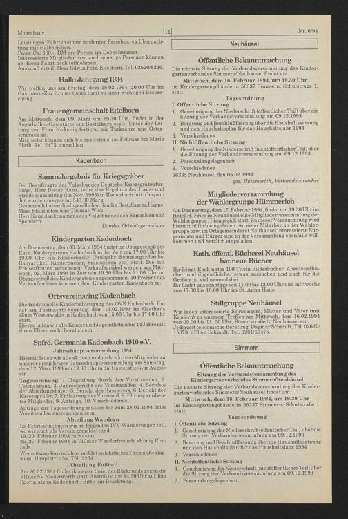 Am Donnerstag, dem 17. Februar 1994, findet um 19.30 Uhr im Hotel H. Fries in Neuhäusel eine Mitgliederversammlung der Wählergruppe Hümmerich statt. Zu dieser Versammlung wird hiermit höflich eingeladen. An einer Mitarbeit in der Wählergruppe bzw. im Ortsgemeinderat Neuhäusel interessierte Bürgerinnen und Bürger sind in der Versammlung ebenfalls willkommen und herzlich eingeladen.