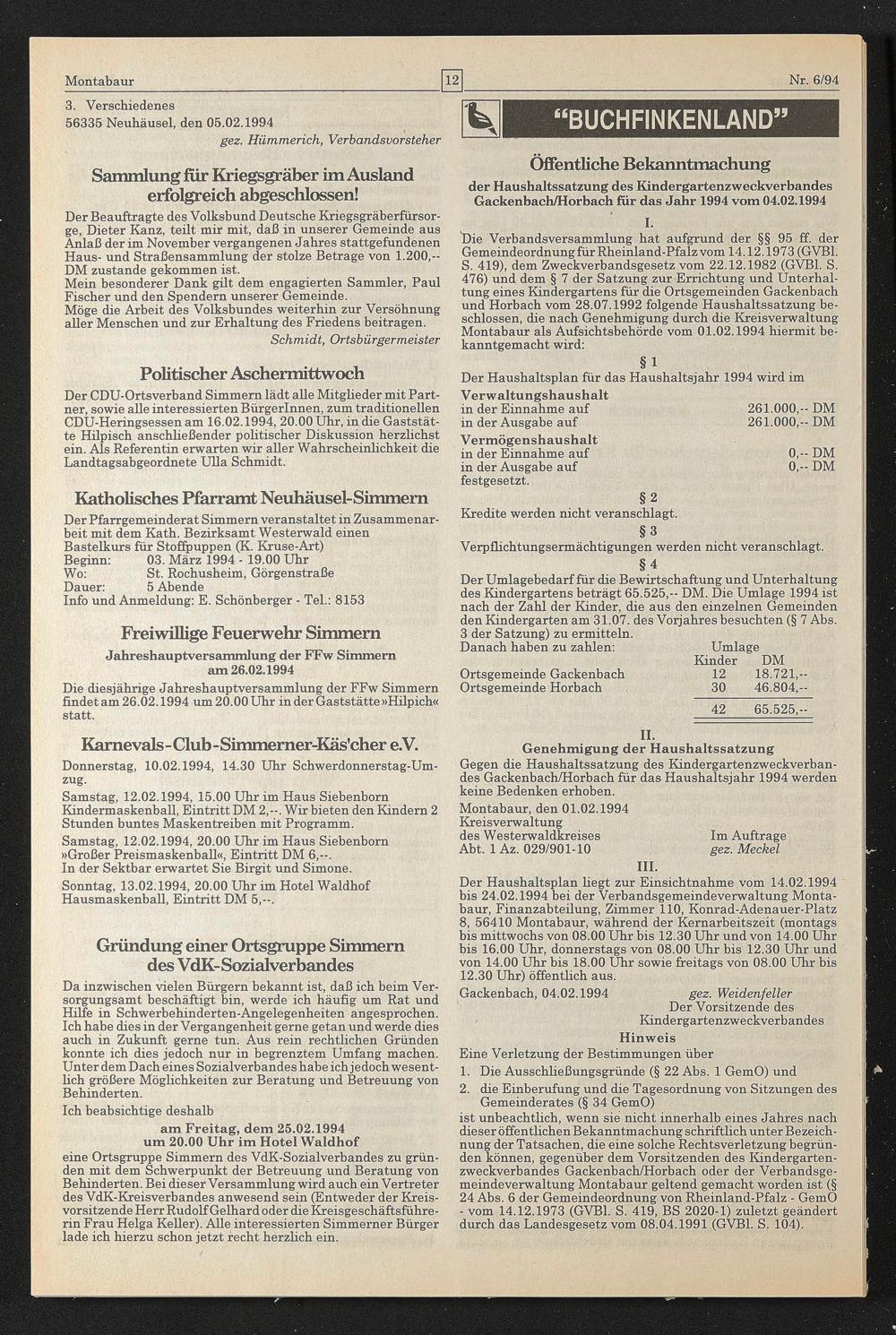 der Haushaltssatzung des Kindergartenzweckverbandes Gackenbach/Horbach für das Jahr 1994 vom 04.02.1994