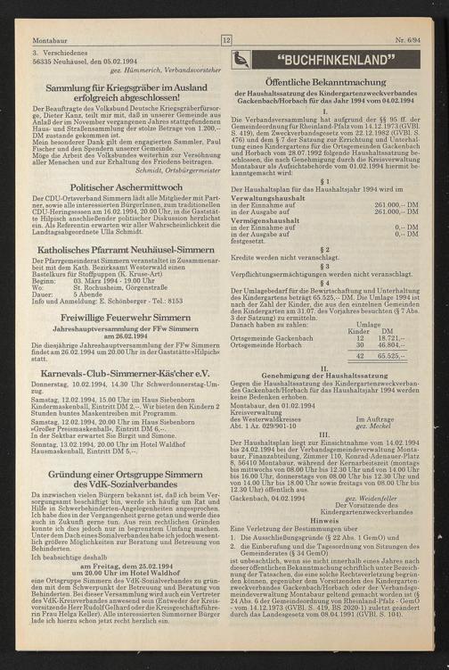 llie Verbandsversammlung hat aufgrund der §§ 95 ff. der Gemeindeordnung für Rheinland-Pfalz vom 14.12.1973 (GVB1. S. 419), dem Zweckverbandsgesetz vom 22.12.1982 (GVB1. S. 476) und dem § 7 der Satzung zur Errichtung und Unterhaltung eines Kindergartens für die Ortsgemeinden Gackenbach und Horbach vom 28.07.1992 folgende Haushaltssatzung beschlossen, die nach Genehmigung durch die Kreisverwaltung Montabaur als Aufsichtsbehörde vom 01.02.1994 hiermit bekanntgemacht wird: