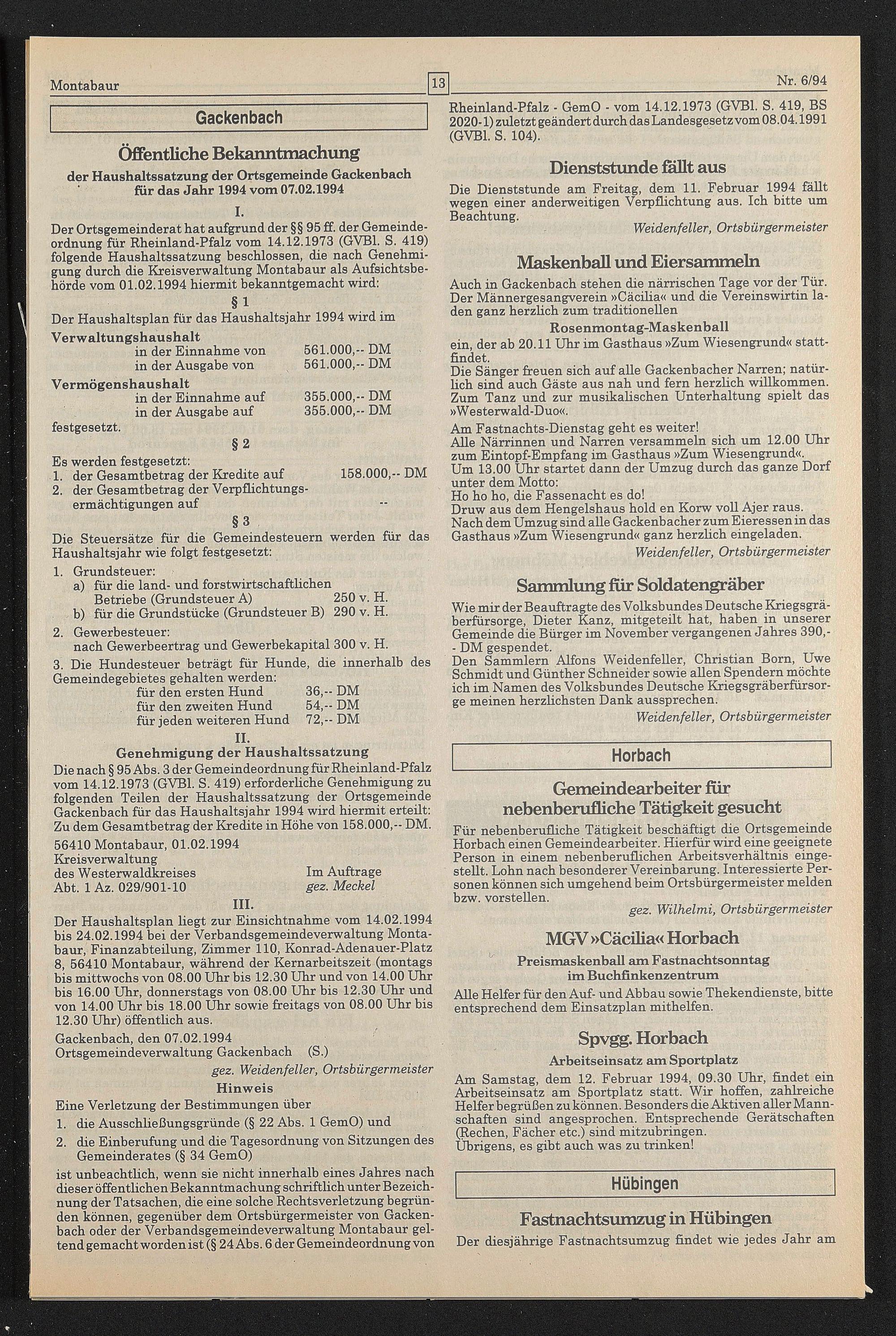 Gackenbach, den 07.02.1994 Ortsgemeindeverwaltung Gackenbach (S.)