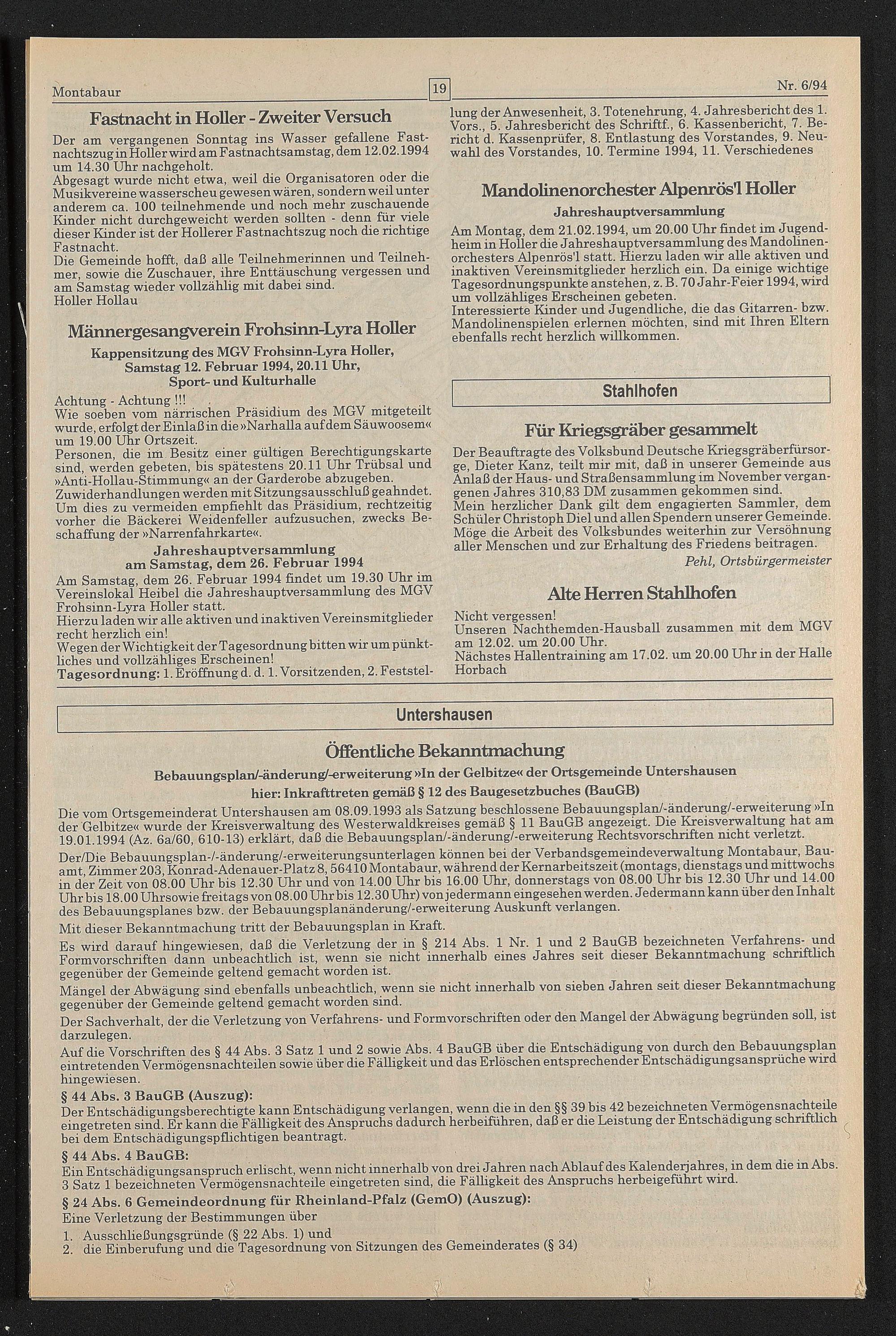 Jahreshauptversammlung am Samstag, dem 26. Februar 1994 Am Samstag, dem 26. Februar 1994 findet um 19.30 Uhr im Vereinslokal Heibel die Jahreshauptversammlung des MGV Frohsinn-Lyra Holler statt.