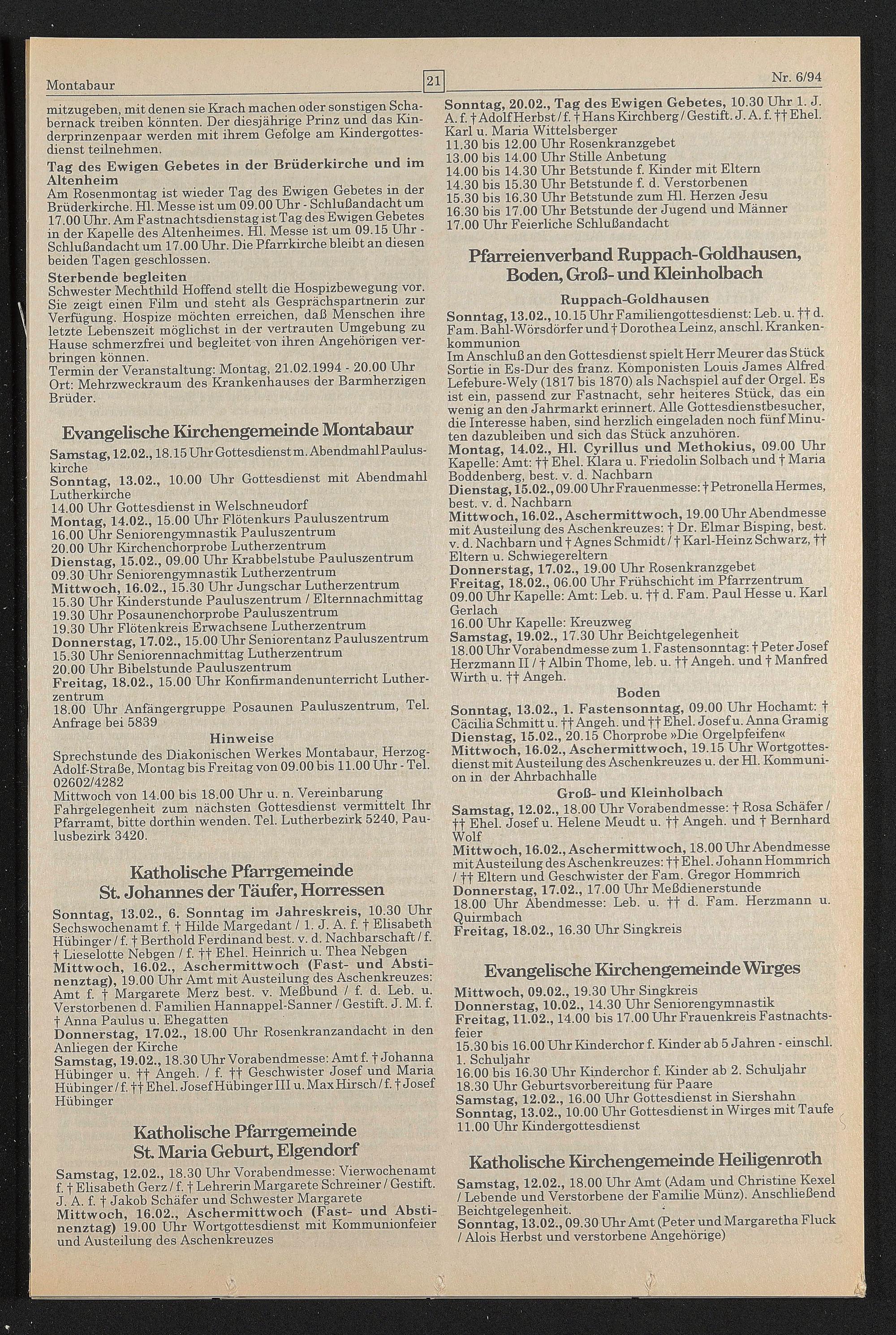 18.30 Uhr Geburtsvorbereitung für Paare Samstag, 12.02., 16.00 Uhr Gottesdienst in Siershahn Sonntag, 13.02., 10.00 Uhr Gottesdienst in Wirges mit Taufe