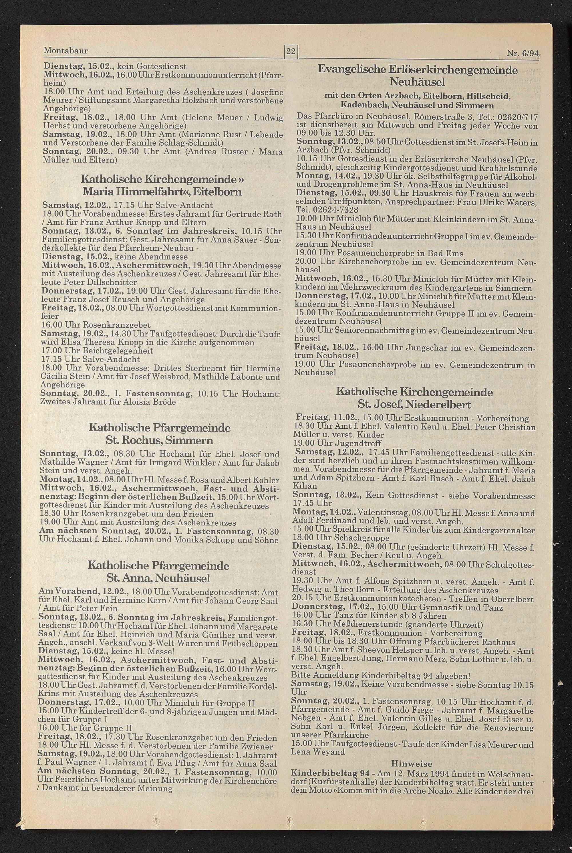 Mittwoch, 16.02., 15.30 Uhr Miniclub für Mütter mit Kleinkindern im Mehrzweckraum des Kindergartens in Simmern Donnerstag, 17.02., 10.00 Uhr Miniclub für Mütter mitKlein- kindern im St. Anna-Haus in Neuhäusel 15.00 Uhr Konfirmandenunterricht Gruppe II im ev. Gemeindezentrum Neuhäusel