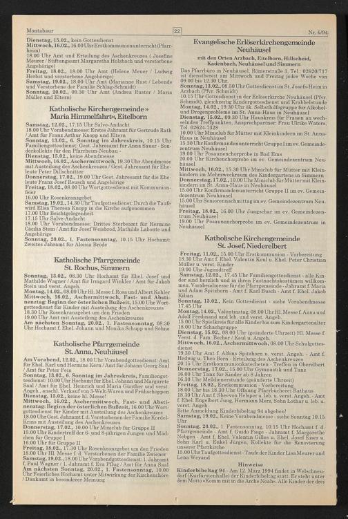 Kinderbibeltag 94 - Am 12. März 1994 findet in Welschneudorf (Kurfürstenhalle) der Kinderbibeltag statt. Er steht unter dem Motto »Komm mit in die Arche Noah«. Alle Kinder der drei