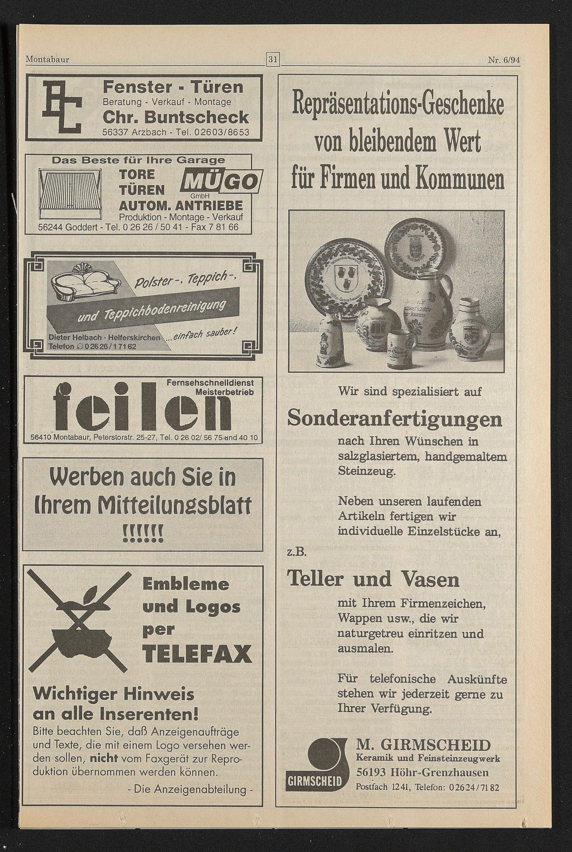 Bitte beachten Sie, daß Anzeigenaufträge und Texte, die mit einem Logo versehen werden sollen, nicht vom Faxgerät zur Reproduktion übernommen werden können.