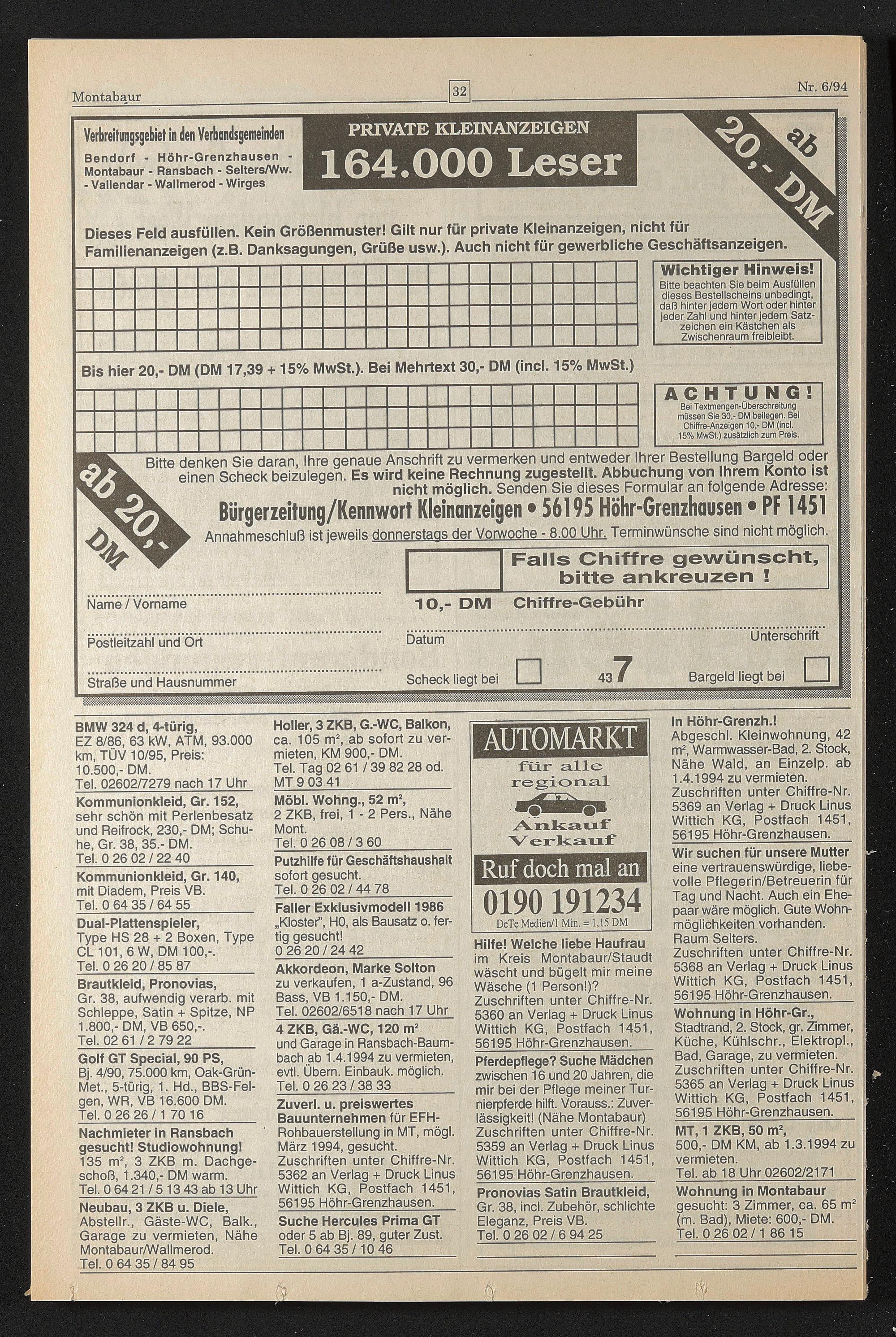 | Bis hier 20,- DM (DM 17,39 +15% MwSt.). Bei Mehrtext 30,- DM (incl. 15% MwSt.)