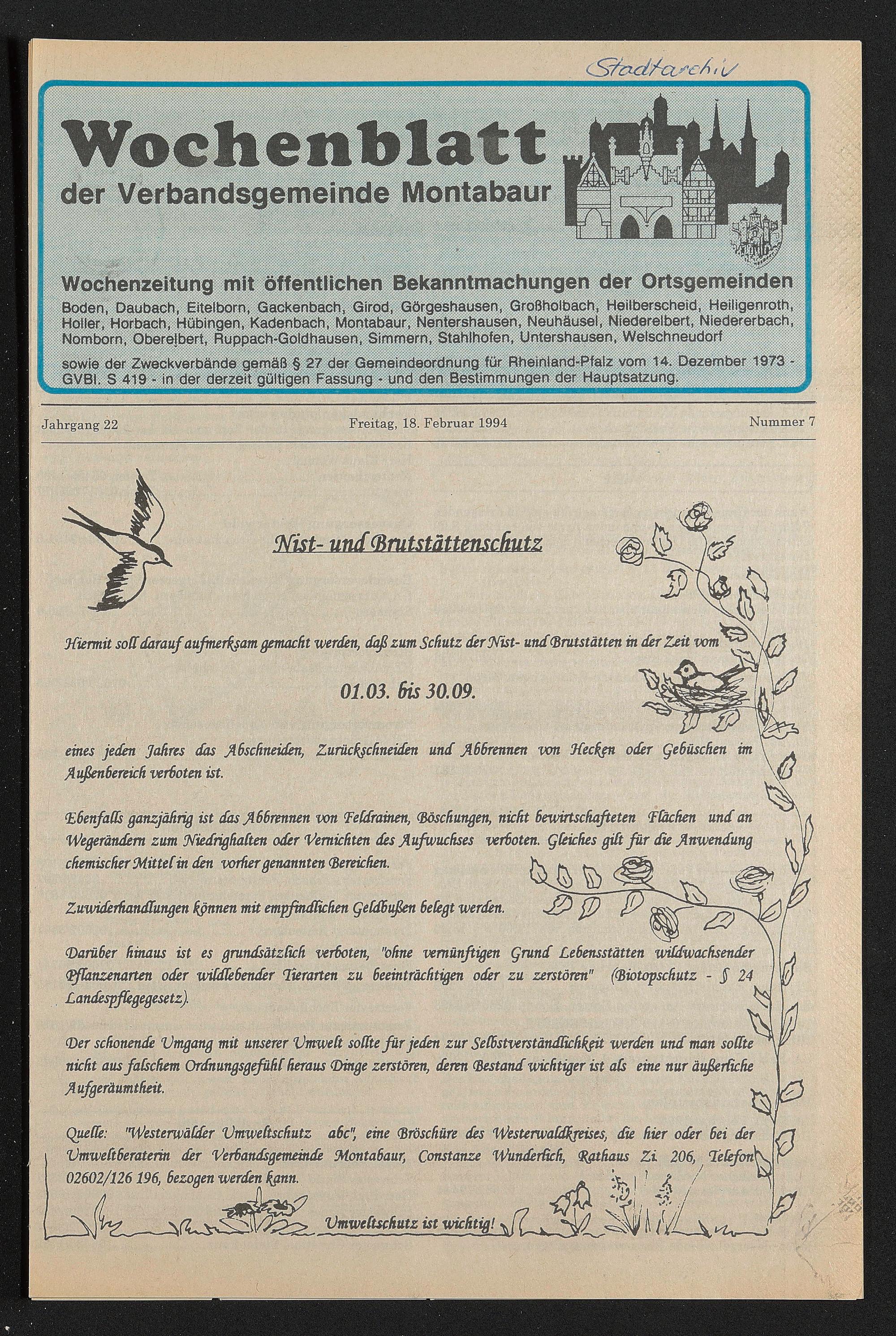 Quelb: "Westerwälder Umweltschutz ahc", eine (Broschüre des Westerwaldhjebes, die hier oder bei der Umwelt6eraterin der Verbandsgememde Montabaur, Constanze Wunderlich, (Rathaus Zi 206, Te(efon\\^ 02602/126196, bezogen werden hßnn. ' ** > J