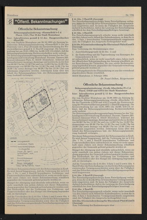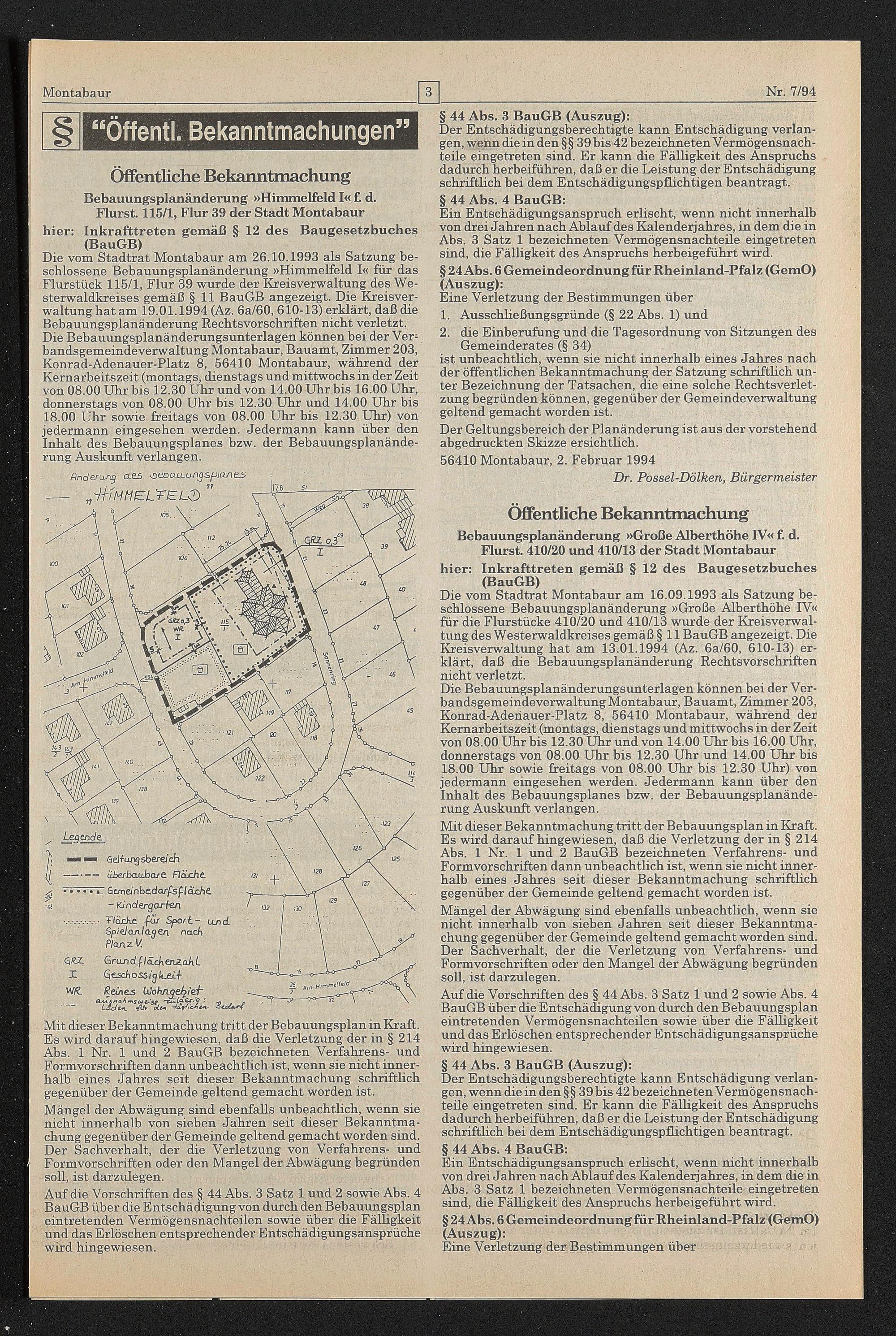 Die vom Stadtrat Montabaur am 26.10.1993 als Satzung beschlossene Bebauungsplanänderung »Himmelfeld I« für das Flurstück 115/1, Flur 39 wurde der Kreisverwaltung des Westerwaldkreises gemäß § 11 BauGB angezeigt. Die Kreisverwaltung hat am 19.01.1994 (Az. 6a/60, 610-13) erklärt, daß die Bebauungsplanänderung Rechtsvorschriften nicht verletzt. Die Bebauungsplanänderungsunterlagen können hei der Ver- bandsgemeindeverwaltung Montabaur, Bauamt, Zimmer 203, Konrad-Adenauer-Platz 8, 56410 Montabaur, während der Kernarbeitszeit (montags, dienstags und mittwochs in der Zeit von 08.00 Uhr bis 12.30 Uhr und von 14.00 Uhr bis 16.00 Uhr, donnerstags von 08.00 Uhr bis 12.30 Uhr und 14.00 Uhr bis 18.00 Uhr sowie freitags von 08.00 Uhr bis 12.30 Uhr) von jedermann eingesehen werden. Jedermann kann über den Inhalt des Bebauungsplanes bzw. der Bebauungsplanänderung Auskunft verlangen.