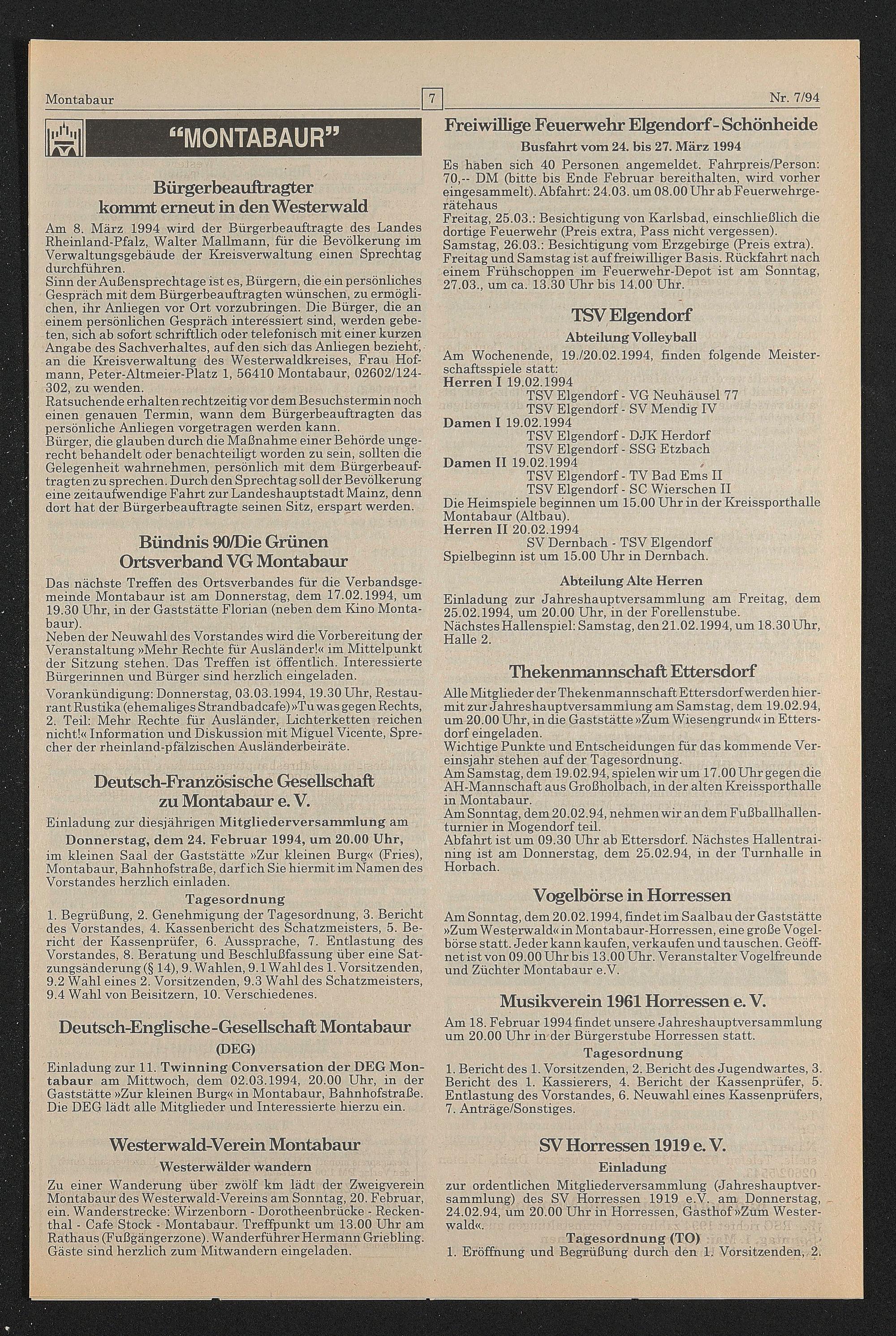 Das nächste Treffen des Ortsverbandes für die Verbandsgemeinde Montabaur ist am Donnerstag, dem 17.02.1994, um 19.30 Uhr, in der Gaststätte Florian (neben dem Kino Montabaur).