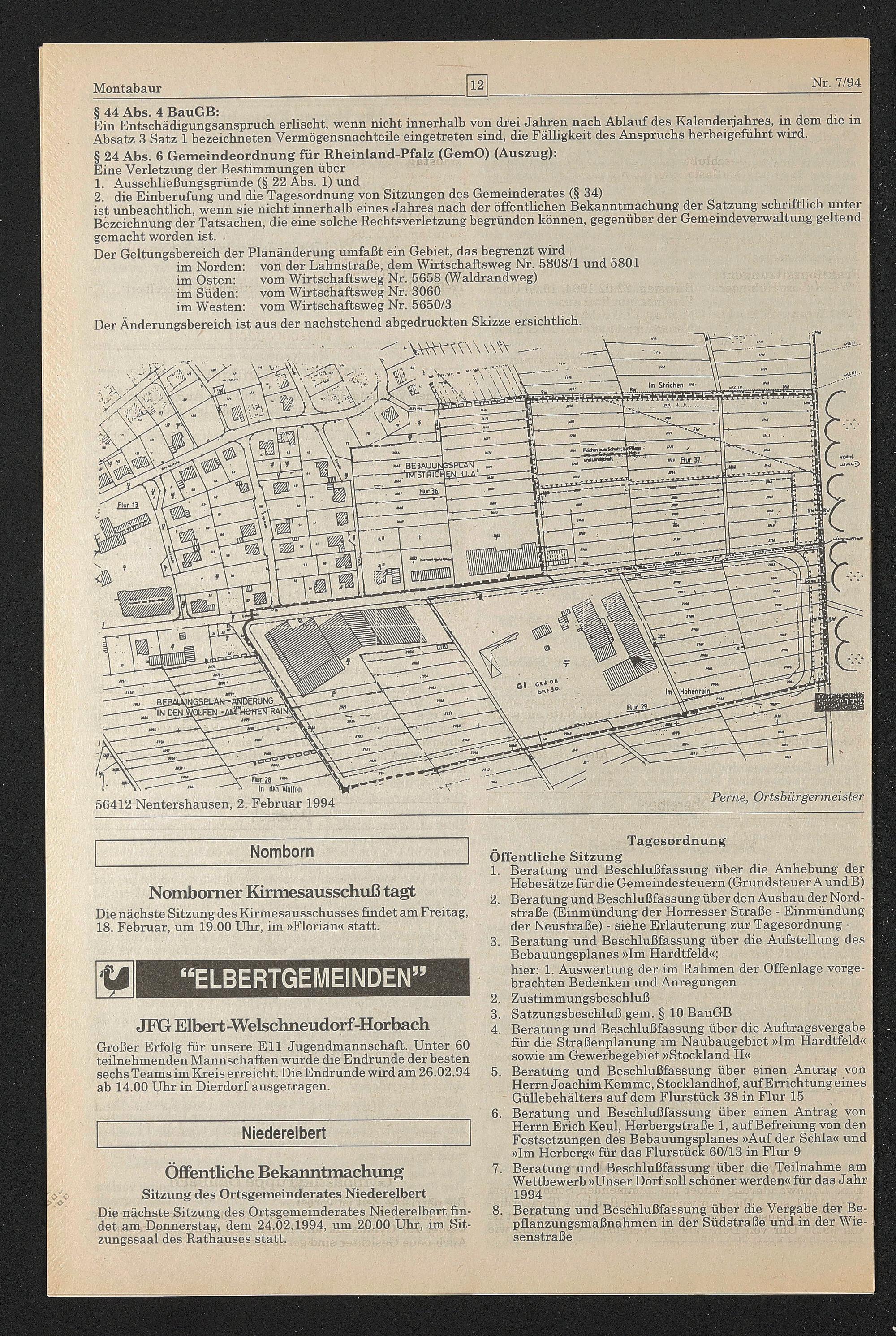 Die nächste Sitzung des Ortsgemeinderates Niederelbert findet am. Donnerstag, dem 24.02.1994, um 20.00 Uhr, im Sitzungssaal des Rathauses statt.
