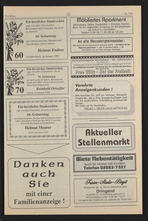 Bitte beachten Sie, daß wir Vorlagen, Reinzeichnungen etc., die in Ihrer Anzeige erschienen sind, nur auf ausdrückliche Anforderung zurücksenden können.