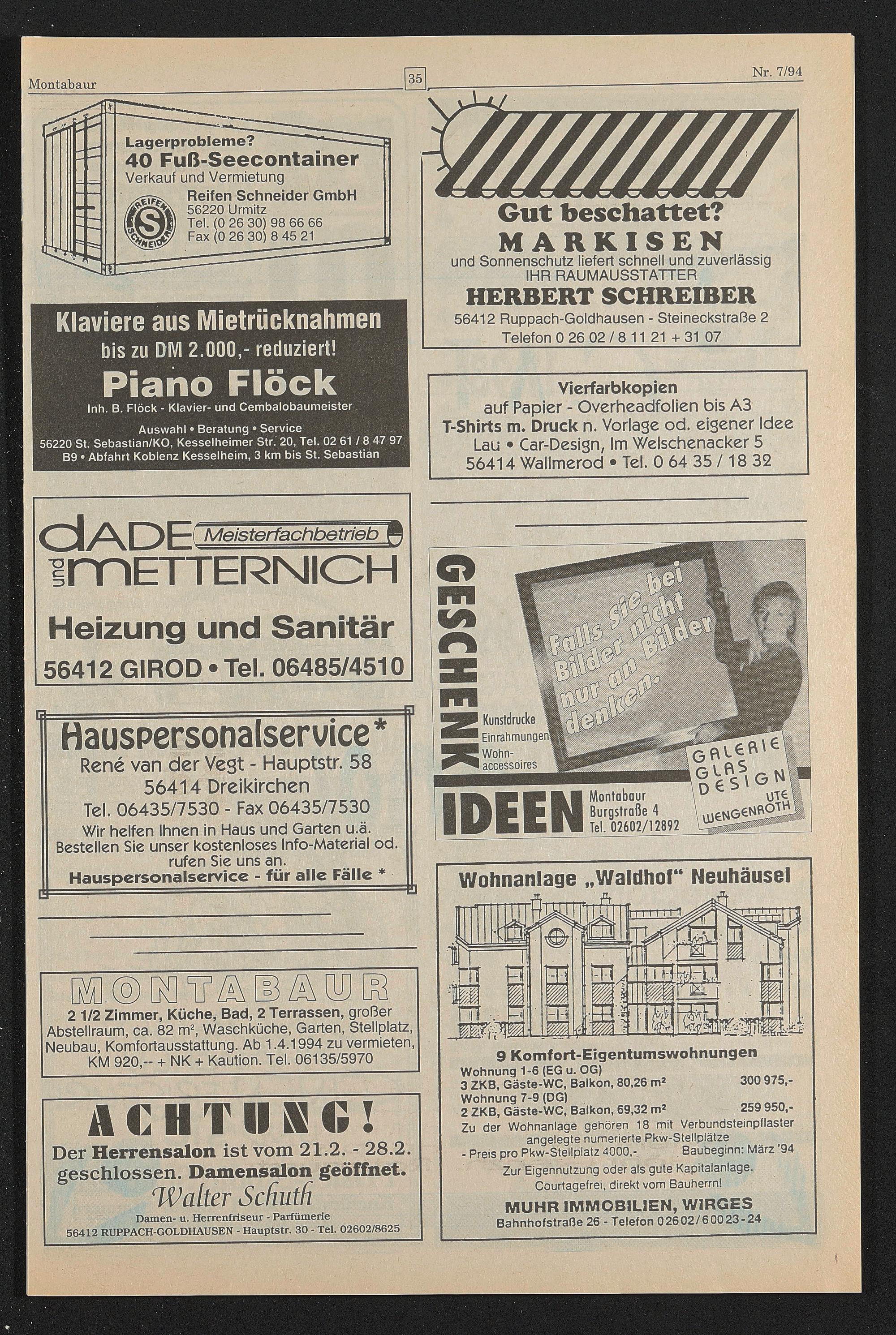 2 1/2 Zimmer, Küche, Bad, 2 Terrassen, großer Abstellraum, ca. 82 m 2 , Waschküche, Garten, Stellplatz, Neubau, Komfortausstattung. Ab 1.4.1994 zu vermieten, KM 920,- + NK + Kaution. Tel. 06135/5970
